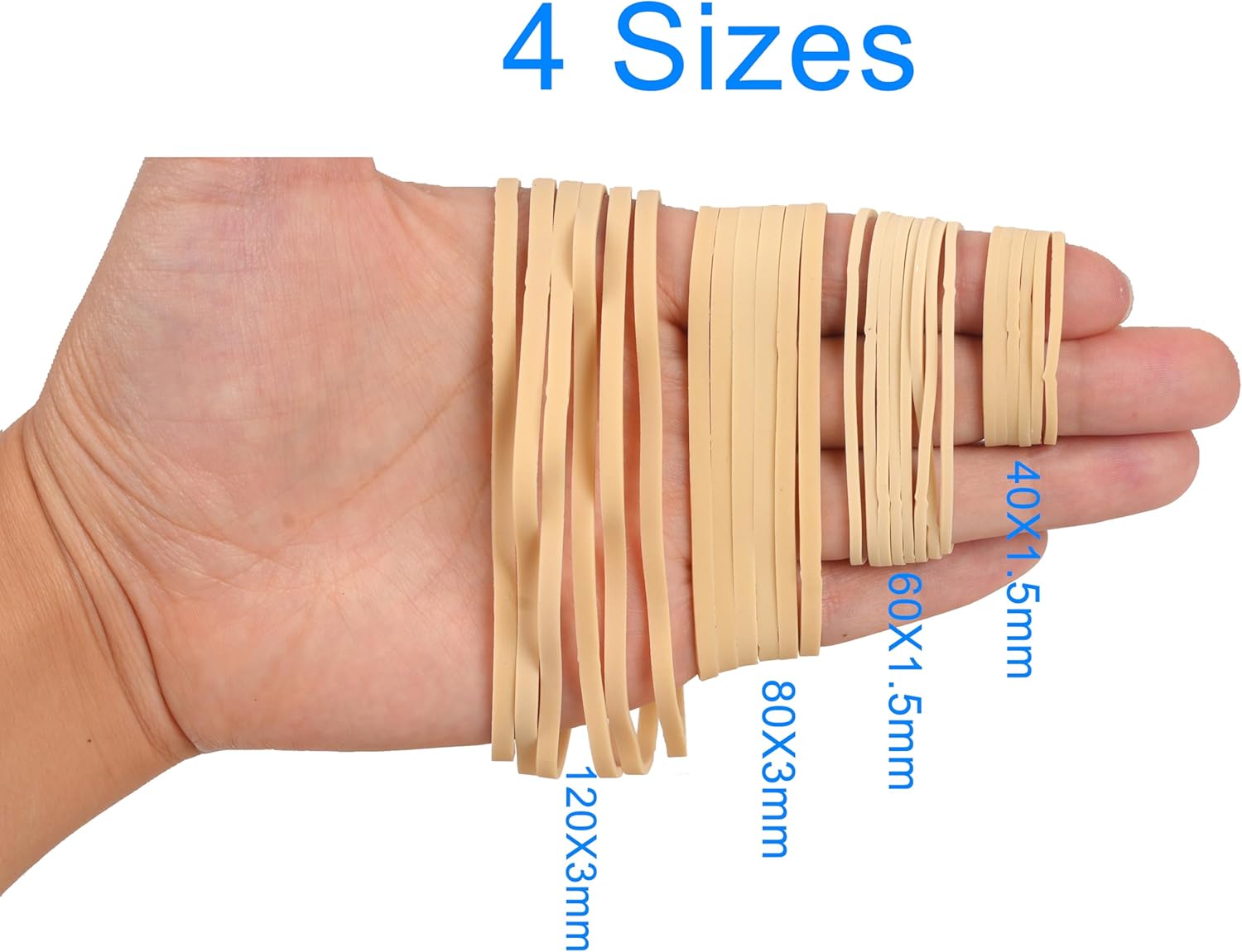 Quantité : poids net de 190 g d’élastiques en caoutchouc, les quantités riches peuvent durer longtemps.Dimensions : (40 x 1,5 mm), (60 x 1,5 mm), (80 x 3 mm), (120 x 3 mm).