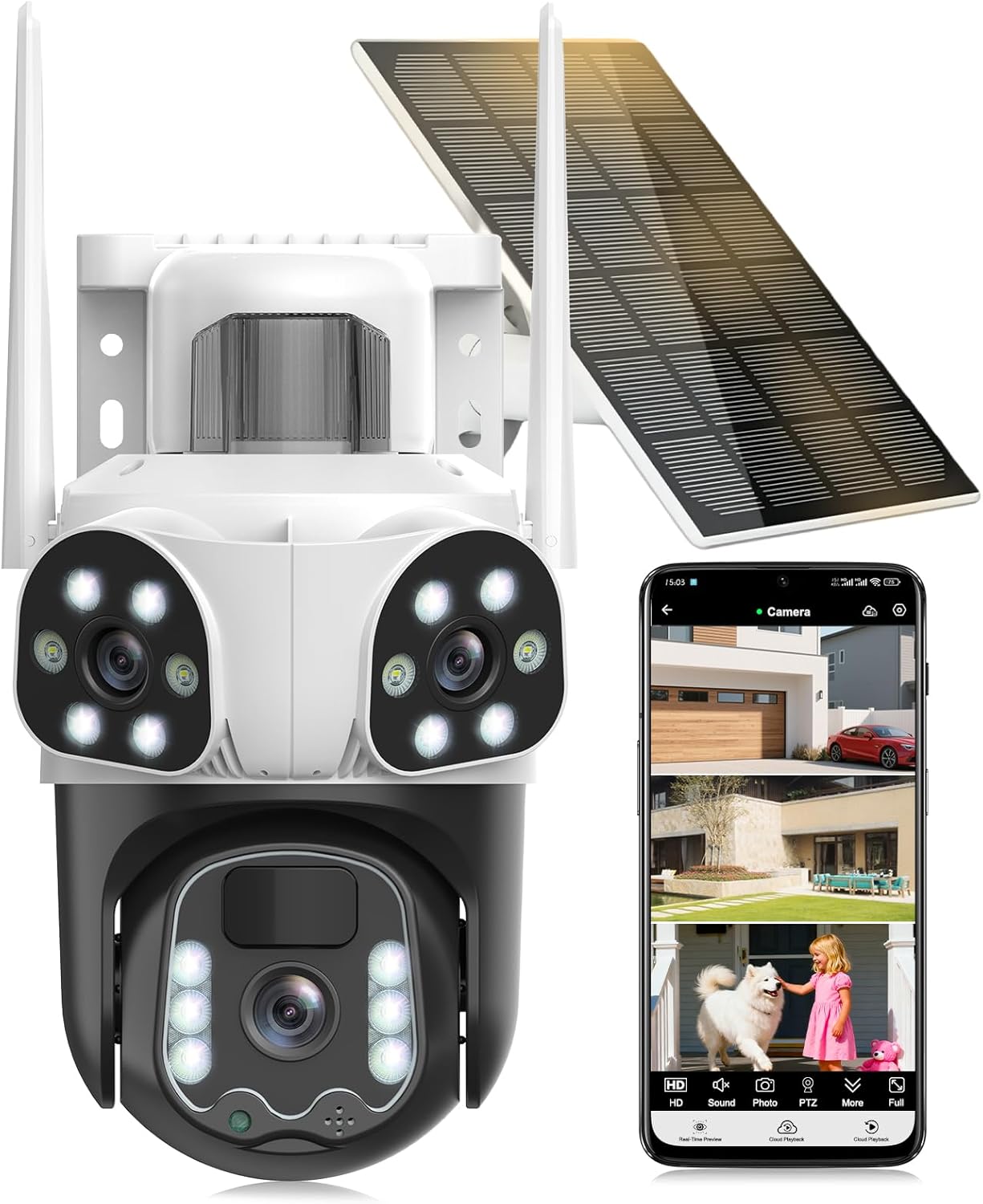 Caméra de surveillance à triple objectif : la caméra de sécurité solaire Budsun offre une résolution de 8 mégapixels avec trois objectifs, permettant une surveillance de nouvelle génération totalement innovante. Une couverture réelle à 360° sans angle mort permet de surveiller simultanément trois directions. Il répond aux besoins de surveillance extérieure de grandes surfaces telles que les jardins, les étangs et les fermes.