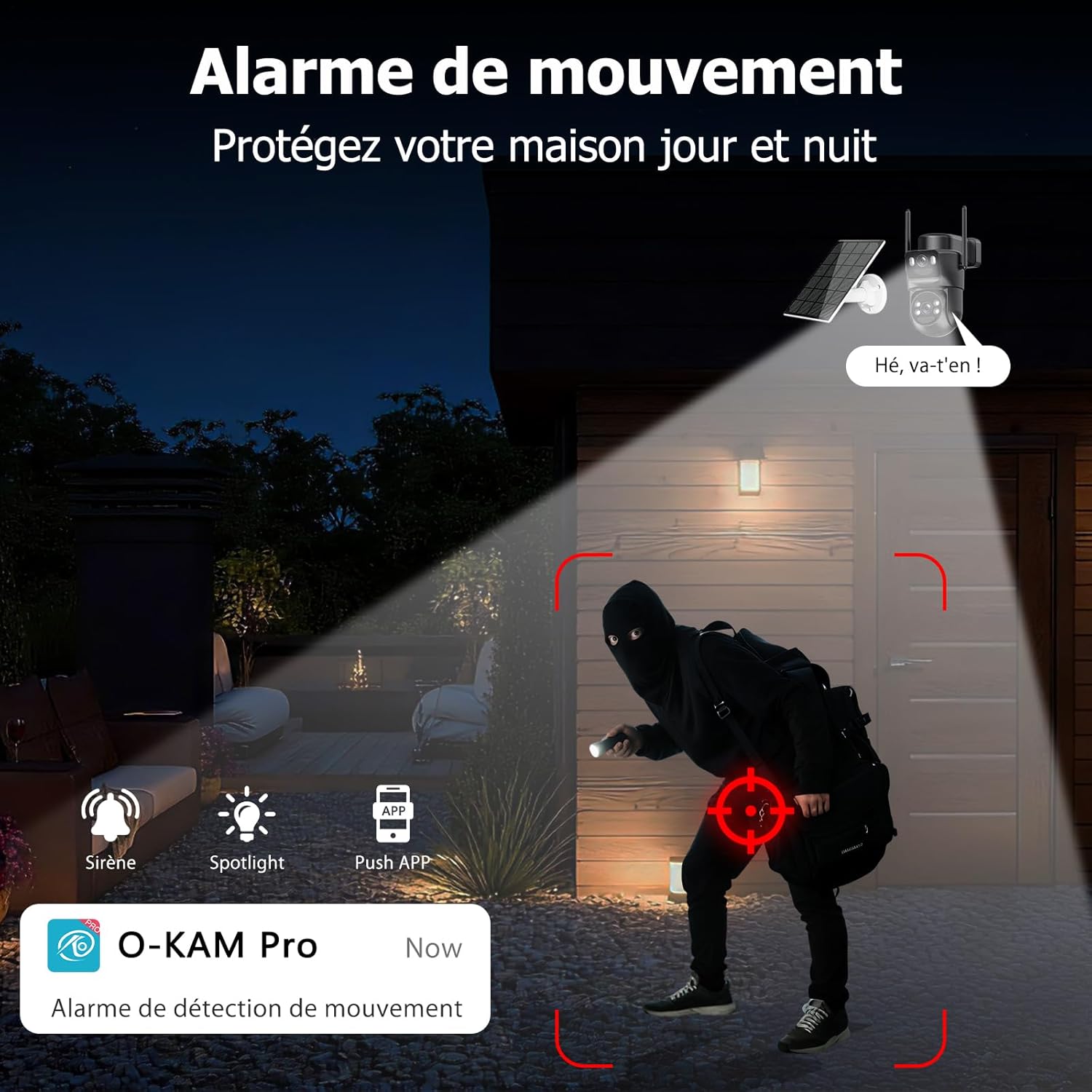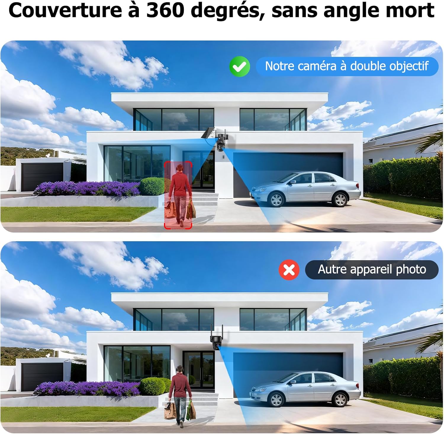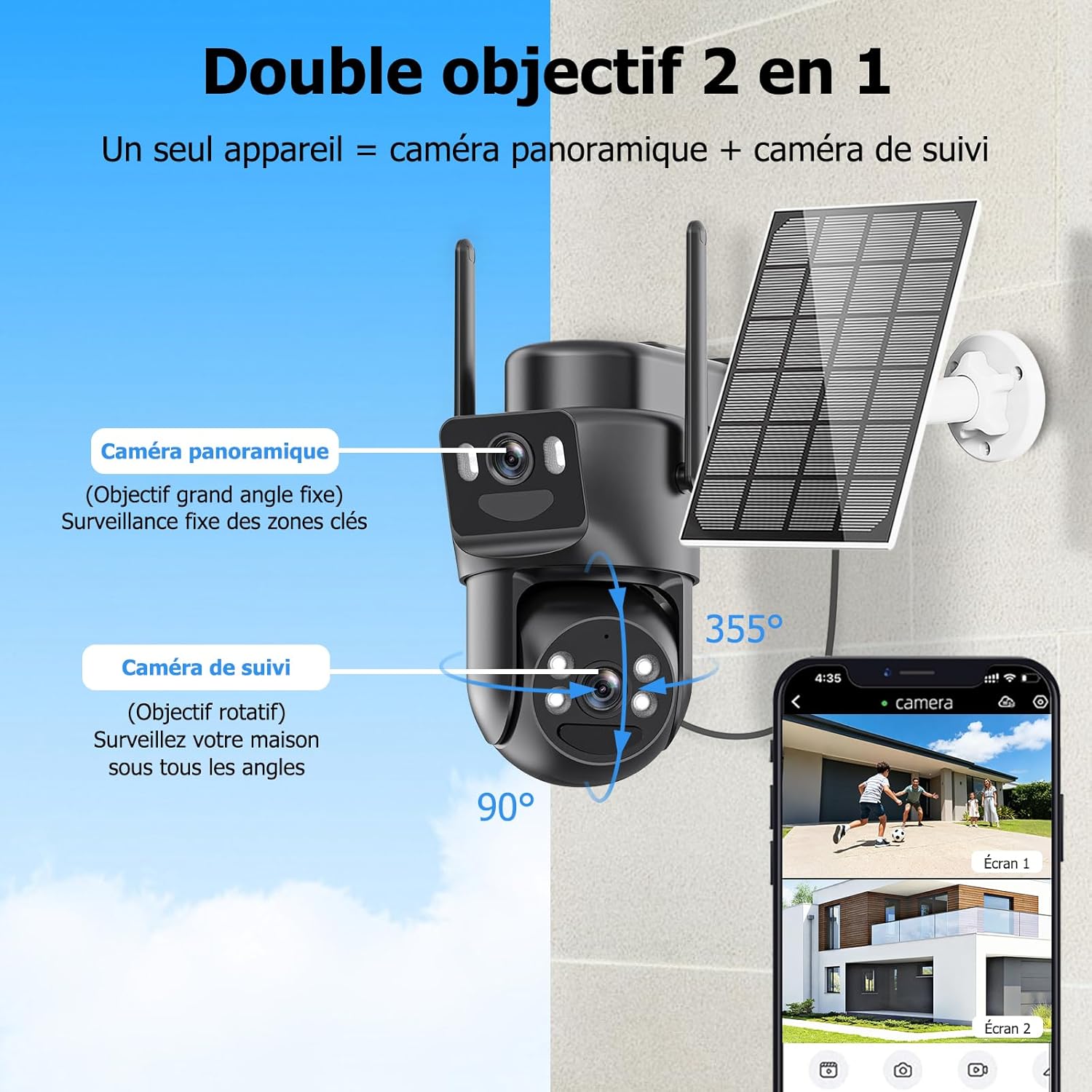 Caméra de surveillance WiFi extérieure sans fil HD, solaire/batterie/double objectif, audio bidirectionnel, sécurité domestique PTZ 360°, suivi automatique, vision vocale, alarme lumineuse et sonore