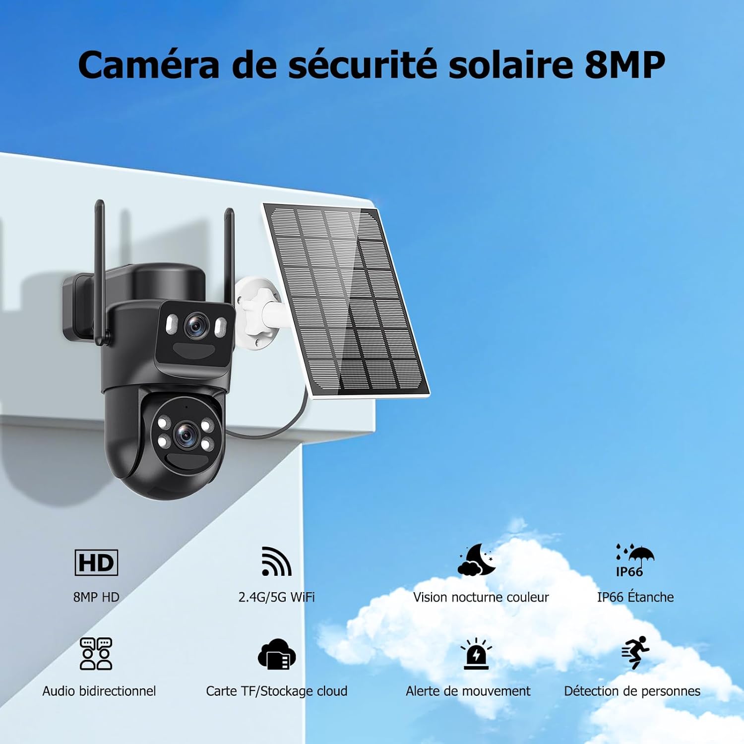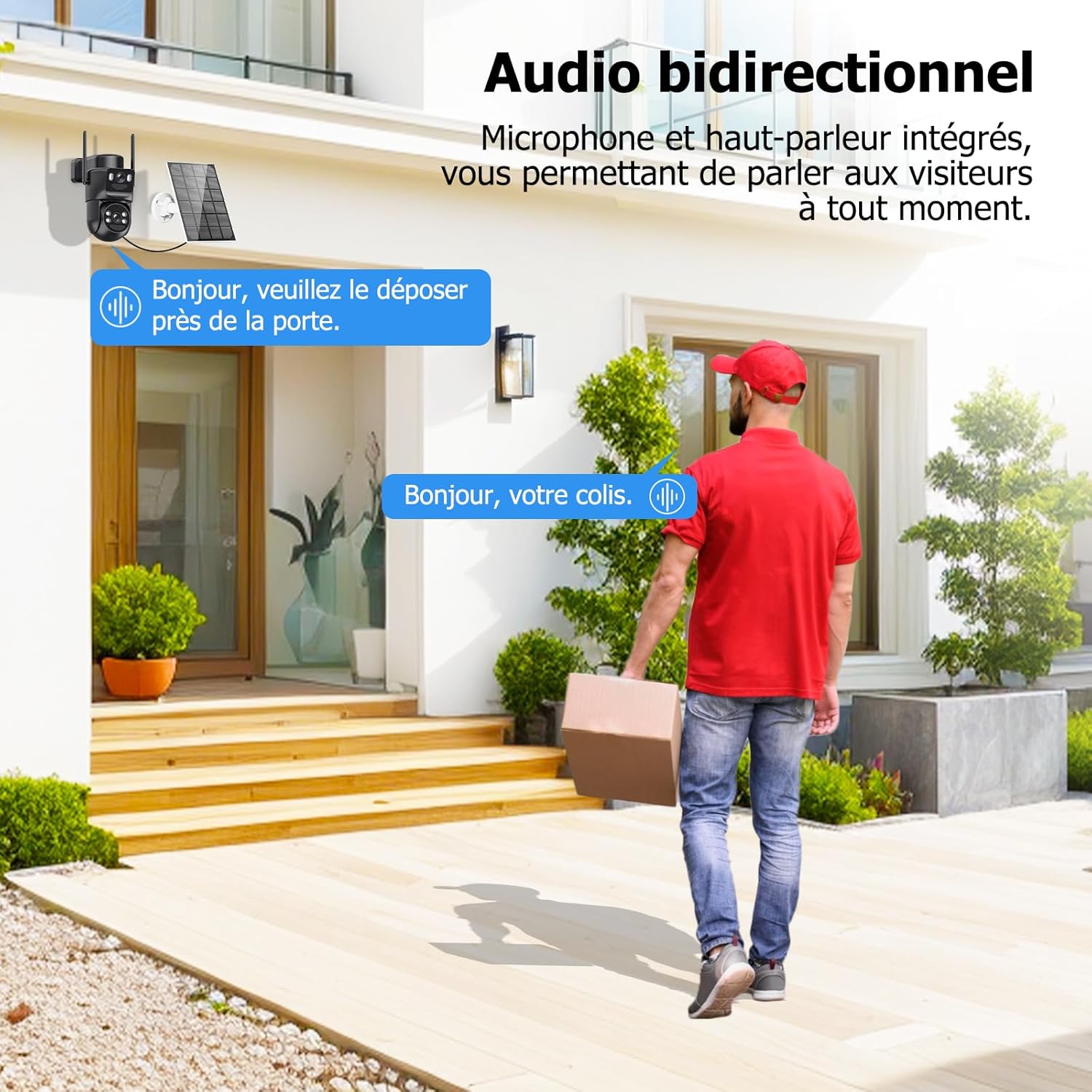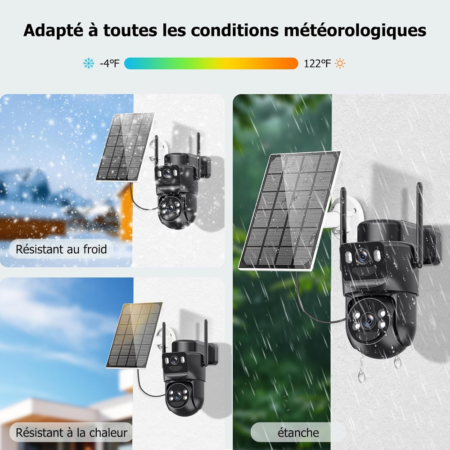 Caméra de surveillance WiFi extérieure sans fil HD, solaire/batterie/double objectif, audio bidirectionnel, sécurité domestique PTZ 360°, suivi automatique, vision vocale, alarme lumineuse et sonore
