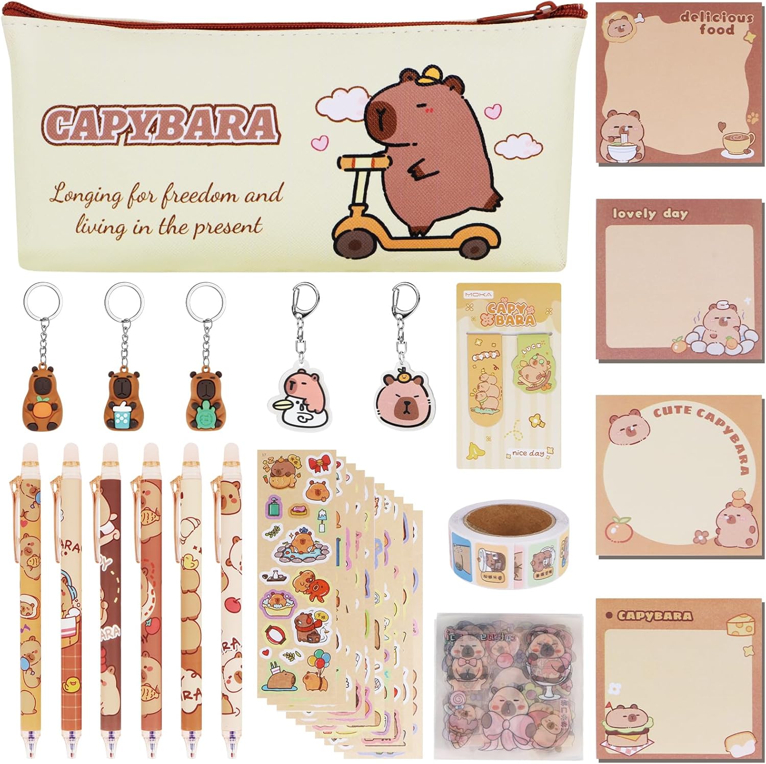 Ensemble de papeterie Kawaii : la papeterie Capybara comprend 1 x trousse à crayons Capybara, 3 x porte-clés Capybara, 2 x mini pendentifs, 2 x marque-pages magnétiques, 6 x stylos effaçables Capybara, 4 x blocs-notes à motifs (200 feuilles), 30 x autocollants Capybara (10 autocollants mignons + 20 autocollants transparents), 1 x rouleau d’autocollants fourmis, il y a 48 pièces au total.