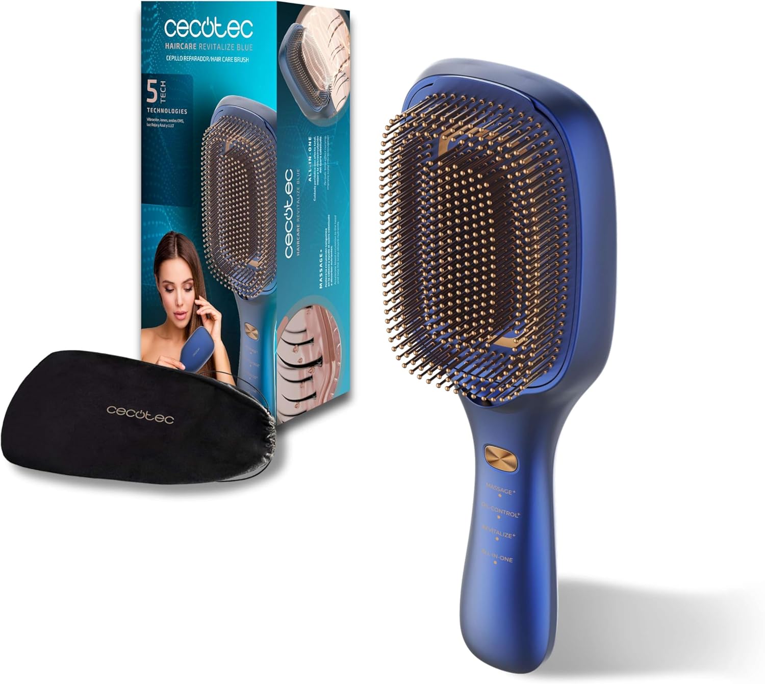 Cecotec HairCare Revitalize Brosse de massage bleue 5-en-1. 4 modes personnalisés, vibrations apaisantes, ions négatifs pour des cheveux lisses, EMS, brosse magnétique pour un nettoyage facile