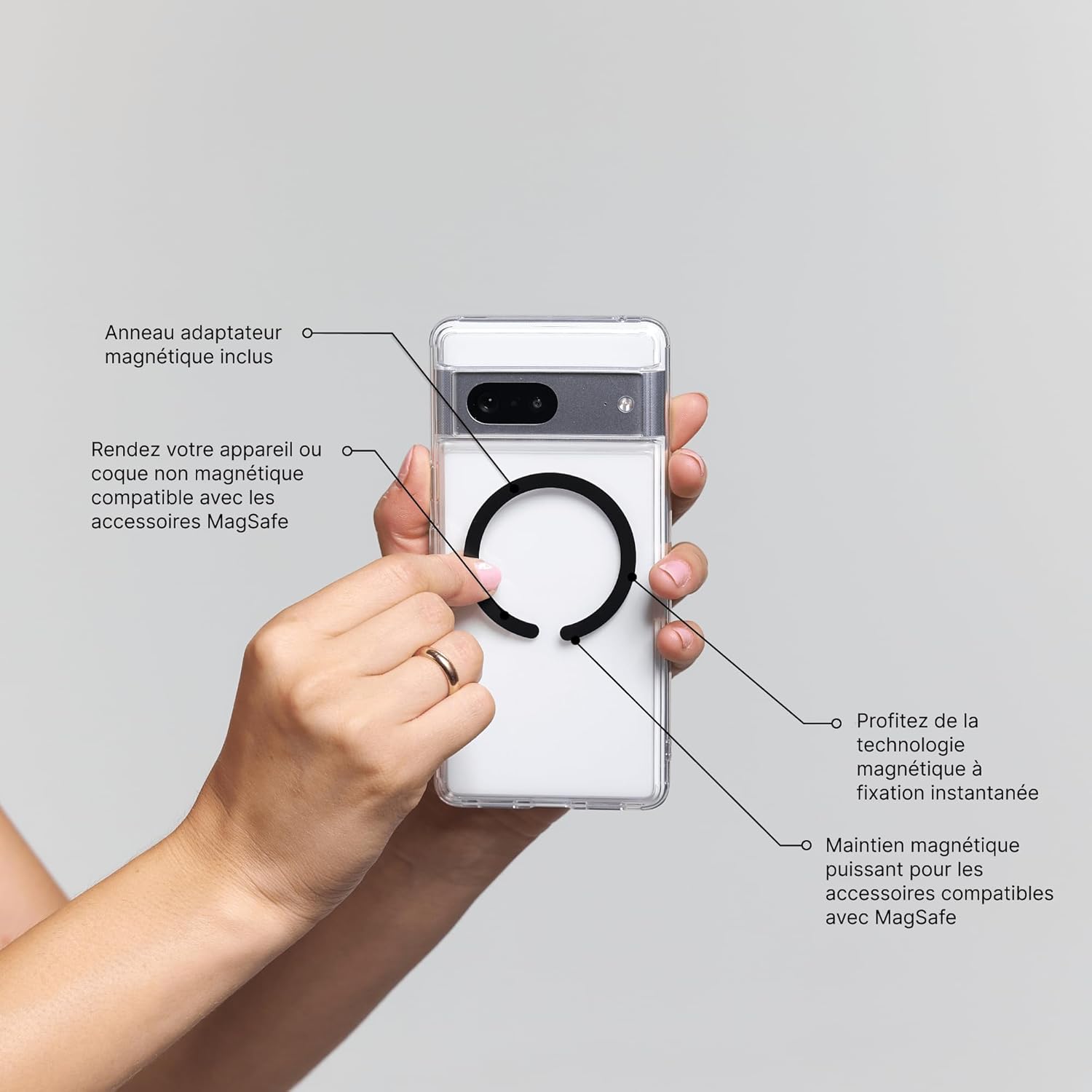 Anneau inclus adaptateur. Rendez n’importe quelle coque de téléphone compatible avec MagSafe en fixant l’adaptateur anneau. Une coque de téléphone est nécessaire mais non incluse pour utiliser le portefeuille.