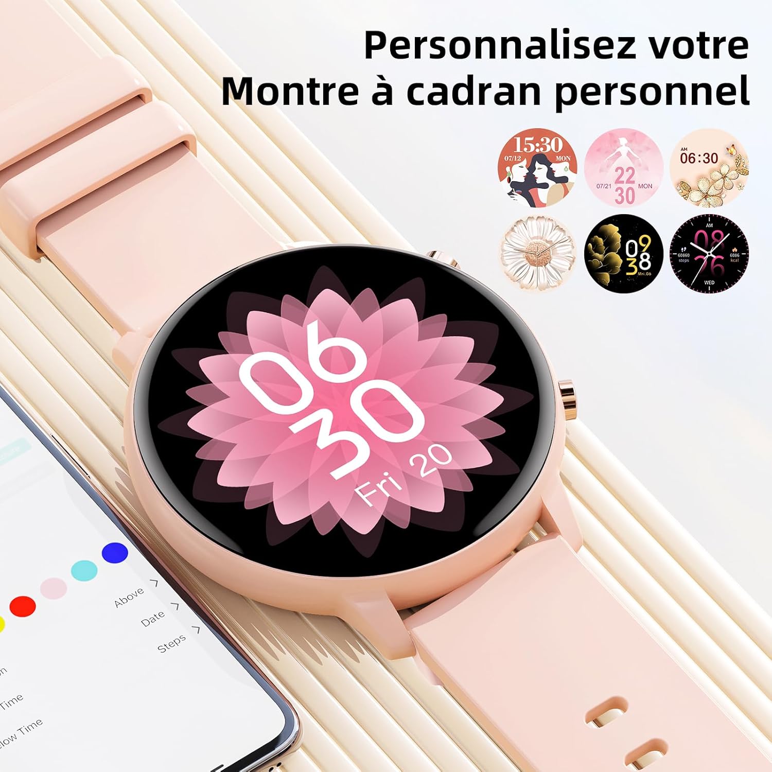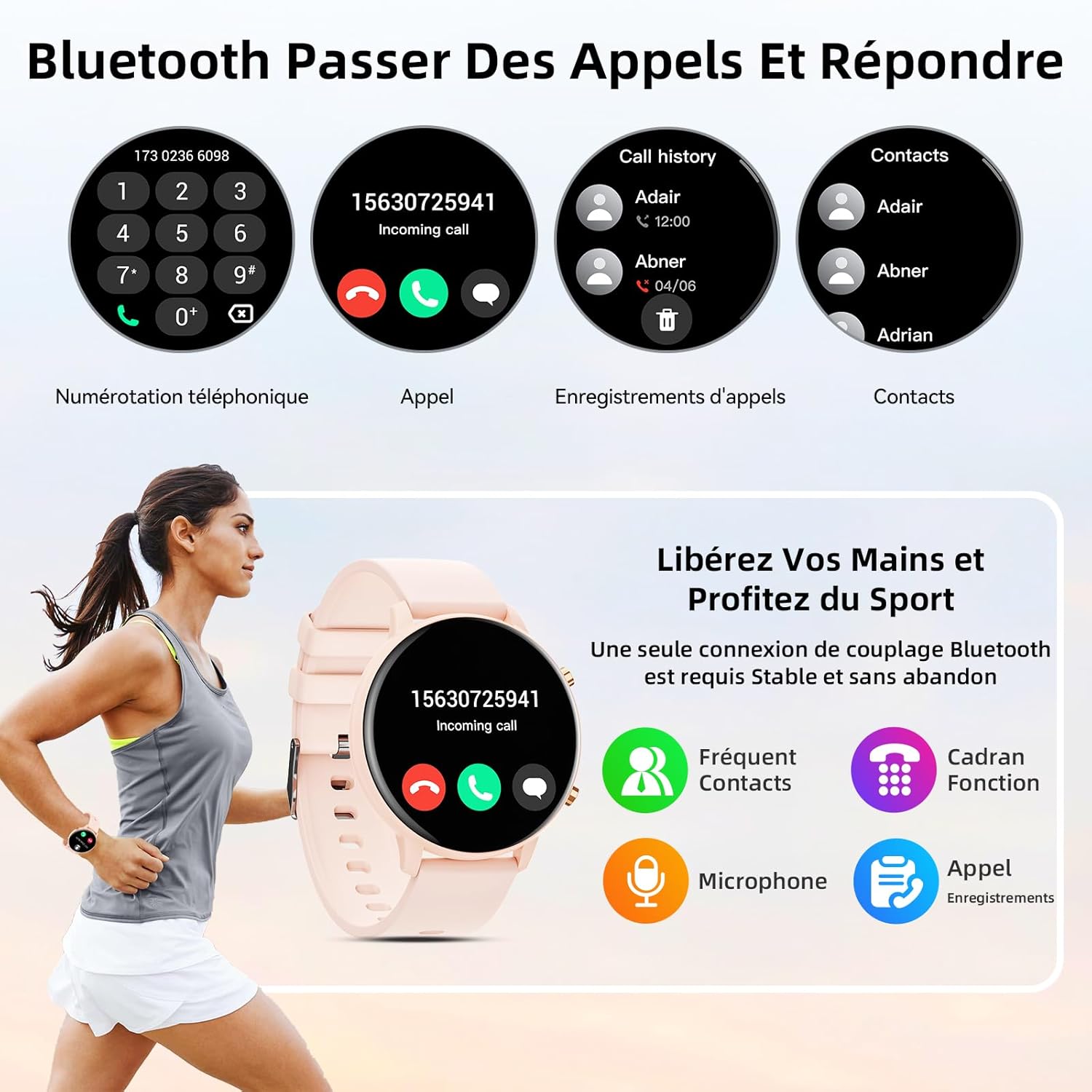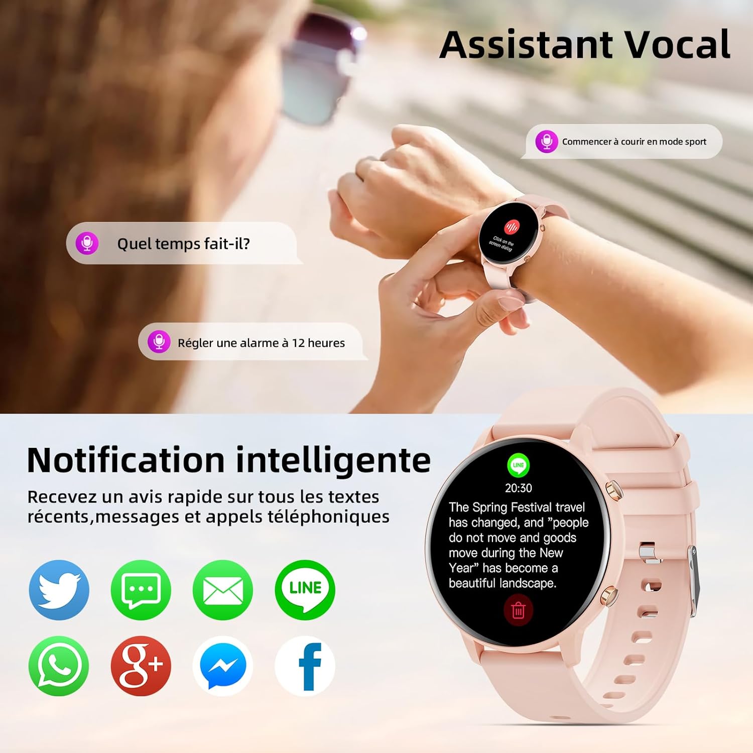 Appel Bluetooth, notifications intelligentes : montre intelligente pour femme avec notifications d’appels et de lettres Bluetooth. Vous permet de consulter l’historique des appels, d’ajouter des contacts réguliers et de passer des appels faciles et confortables. Dans le même temps, il prend également en charge les notifications et les rappels des réseaux sociaux courants tels que Facebook, WhatsApp, etc., vous permettant d’être plus concentré et productif lorsque vous faites du sport ou travaillez.