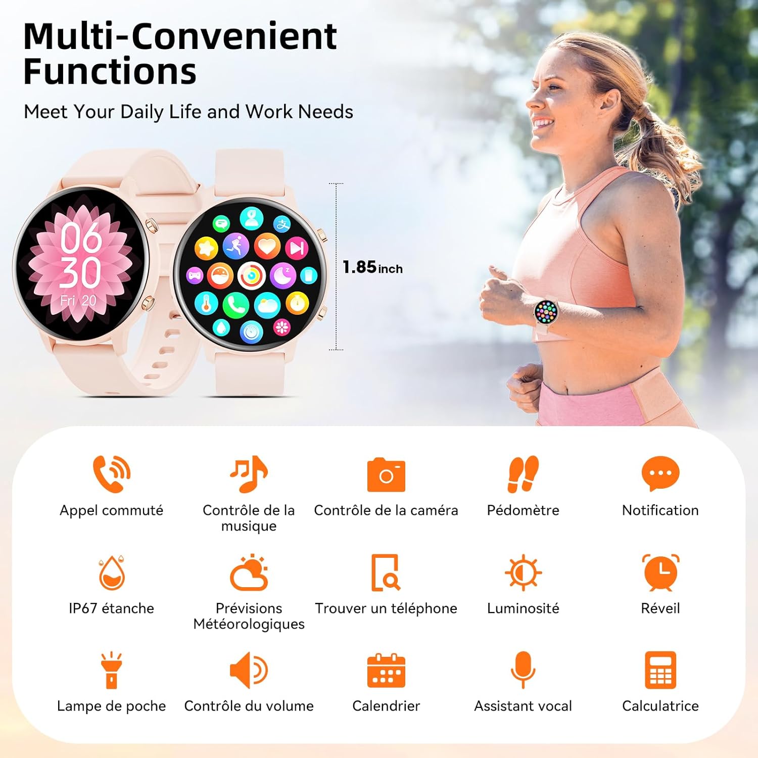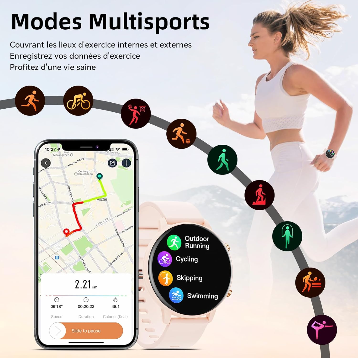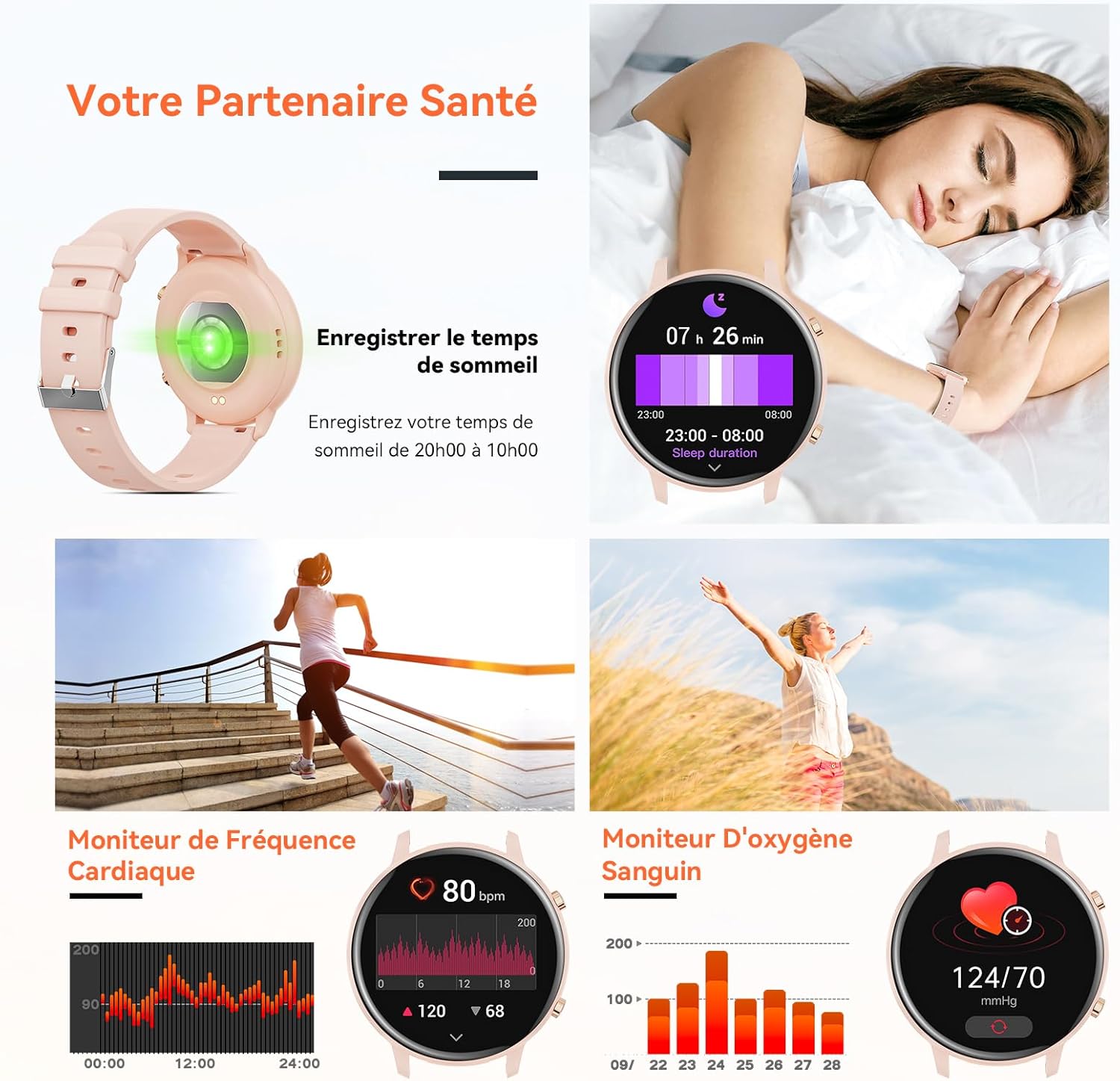 Appel Bluetooth, notifications intelligentes : montre intelligente pour femme avec notifications d’appels et de lettres Bluetooth. Vous permet de consulter l’historique des appels, d’ajouter des contacts réguliers et de passer des appels faciles et confortables. Dans le même temps, il prend également en charge les notifications et les rappels des réseaux sociaux courants tels que Facebook, WhatsApp, etc., vous permettant d’être plus concentré et productif lorsque vous faites du sport ou travaillez.