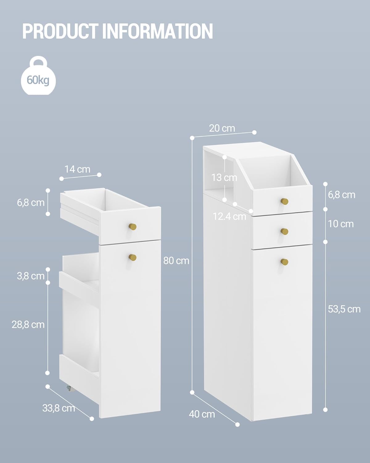 【Gain de place】 D’une dimension de 40 x 20 x 80 cm, ce meuble de rangement n’occupe que 0,08㎡ au sol. Parfait pour les espaces étroits (à côté des toilettes dans la salle de bain ou entre les placards de la cuisine), il crée un rangement supplémentaire. Son design épuré et élégant s’adapte à n’importe quel style de décoration, rendant votre pièce plus rangée et organisée.