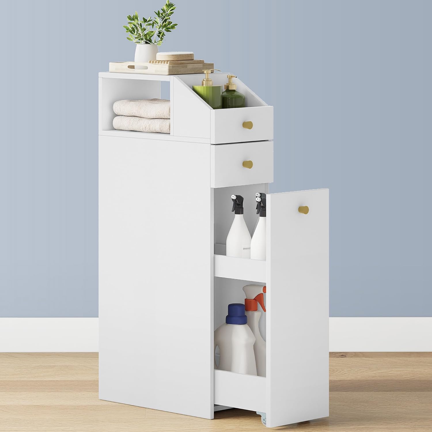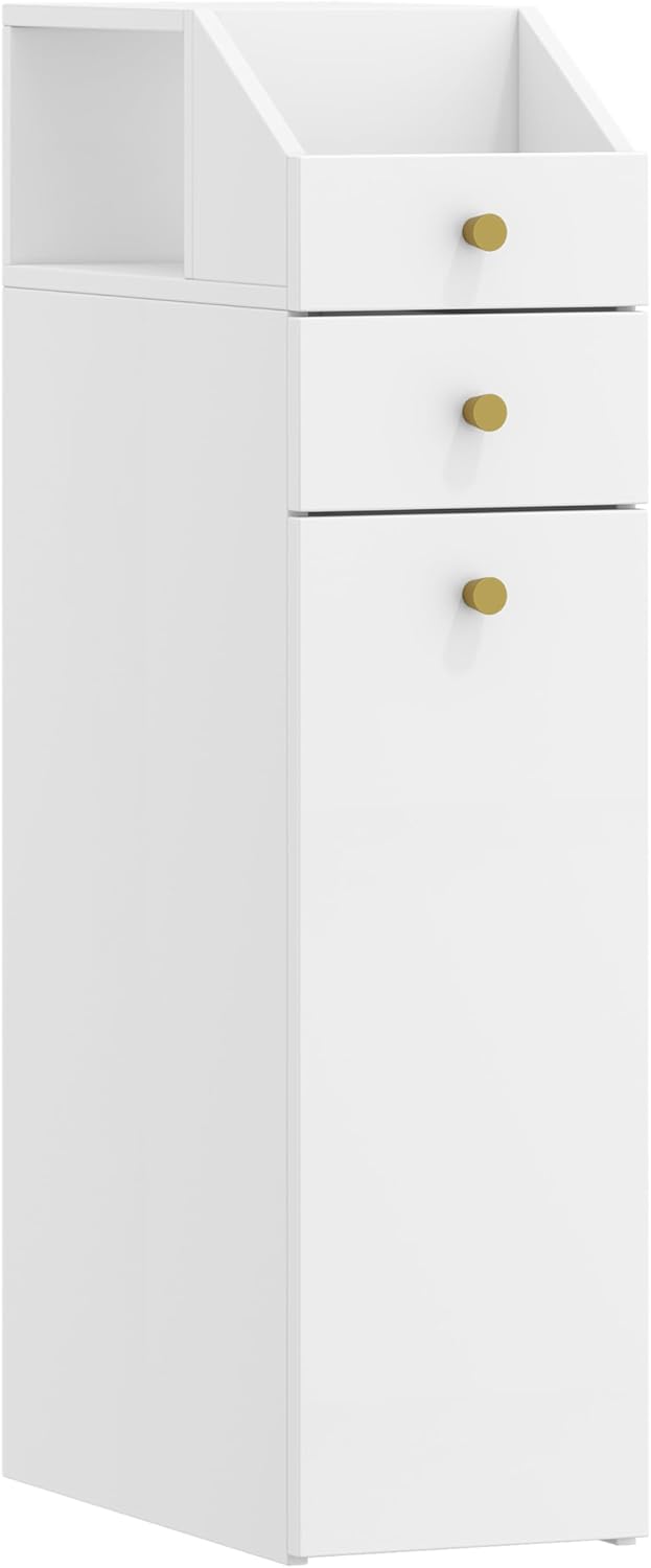 Espace de rangement varié : cette étagère de salle de bain étroite comprend un plateau supérieur pour les articles de toilette ou les petites plantes, une étagère latérale ouverte pour ranger les rouleaux de papier toilette, un panier supérieur pour les bougies parfumées ou les petits objets roulants, un petit tiroir supérieur idéal pour les petits objets essentiels et un tiroir inférieur pour les articles plus gros comme les détergents et autres produits quotidiens. Plusieurs solutions de stockage répondent à vos différents besoins