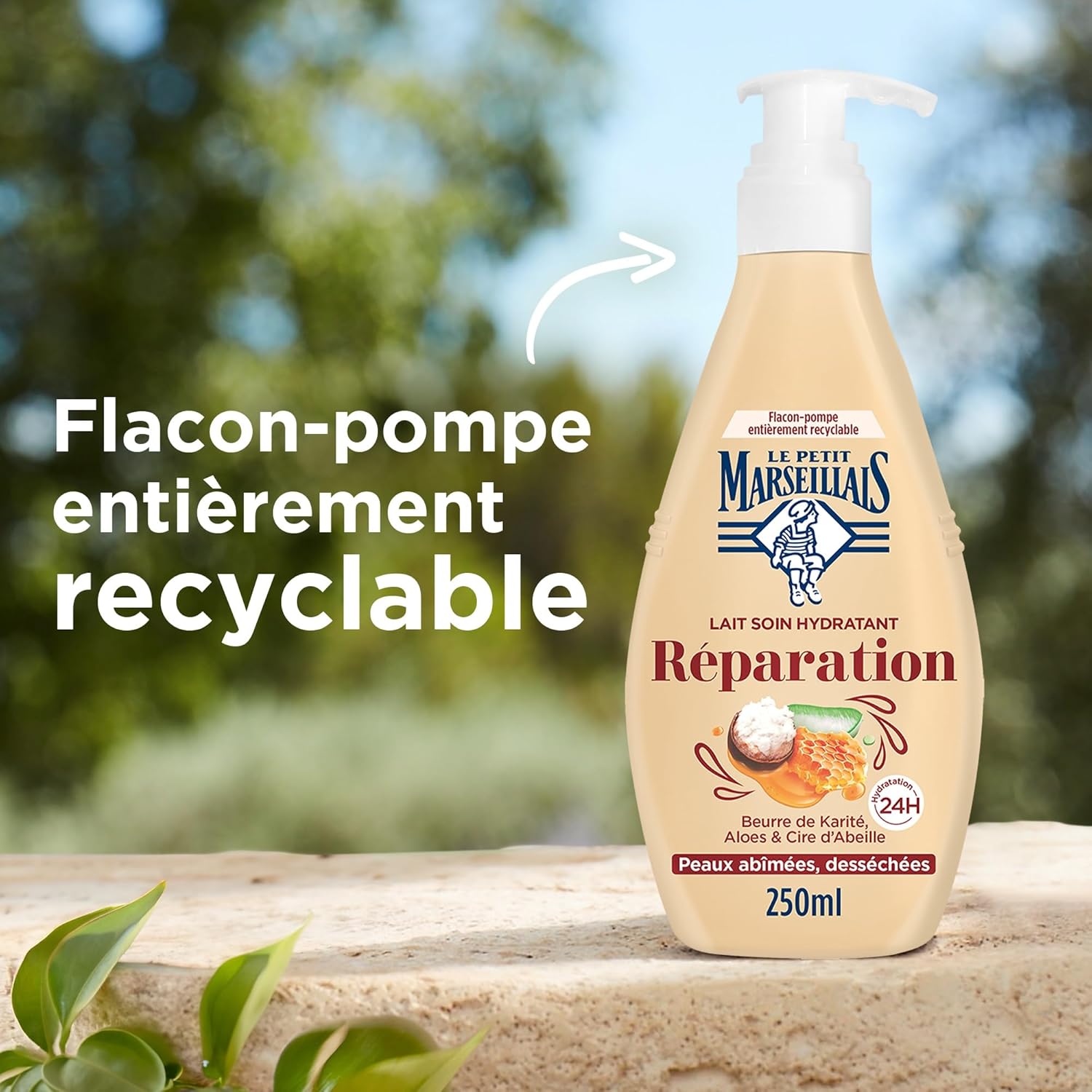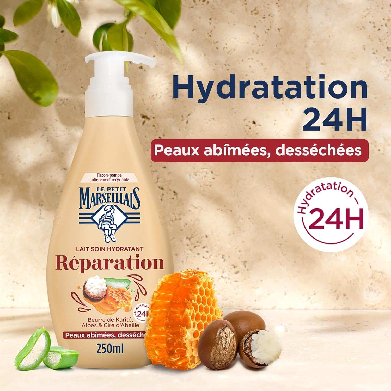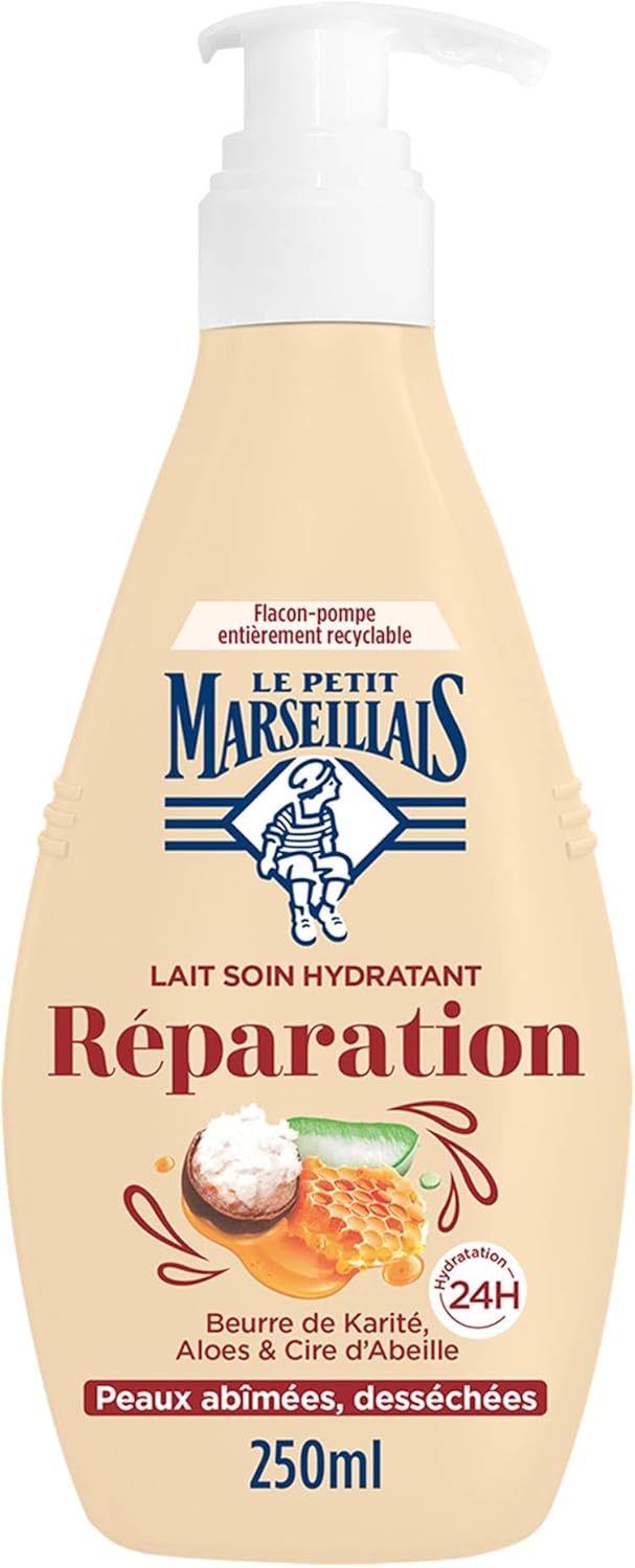 Le Petit Marseillais – Lotion Réparatrice Hydratante (pompe 250 ml) – Lait Corps Peaux Abîmées et Sèches Hydratation 24H – Lait Corporel Beurre de Karité, Aloès et Cire d’Abeille