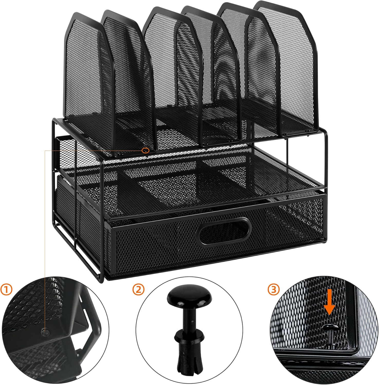 Module de stockage Amazon Basics – Trieur de bureau en maille avec tiroir coulissant, deux plateaux et 5 divisions verticales, noir