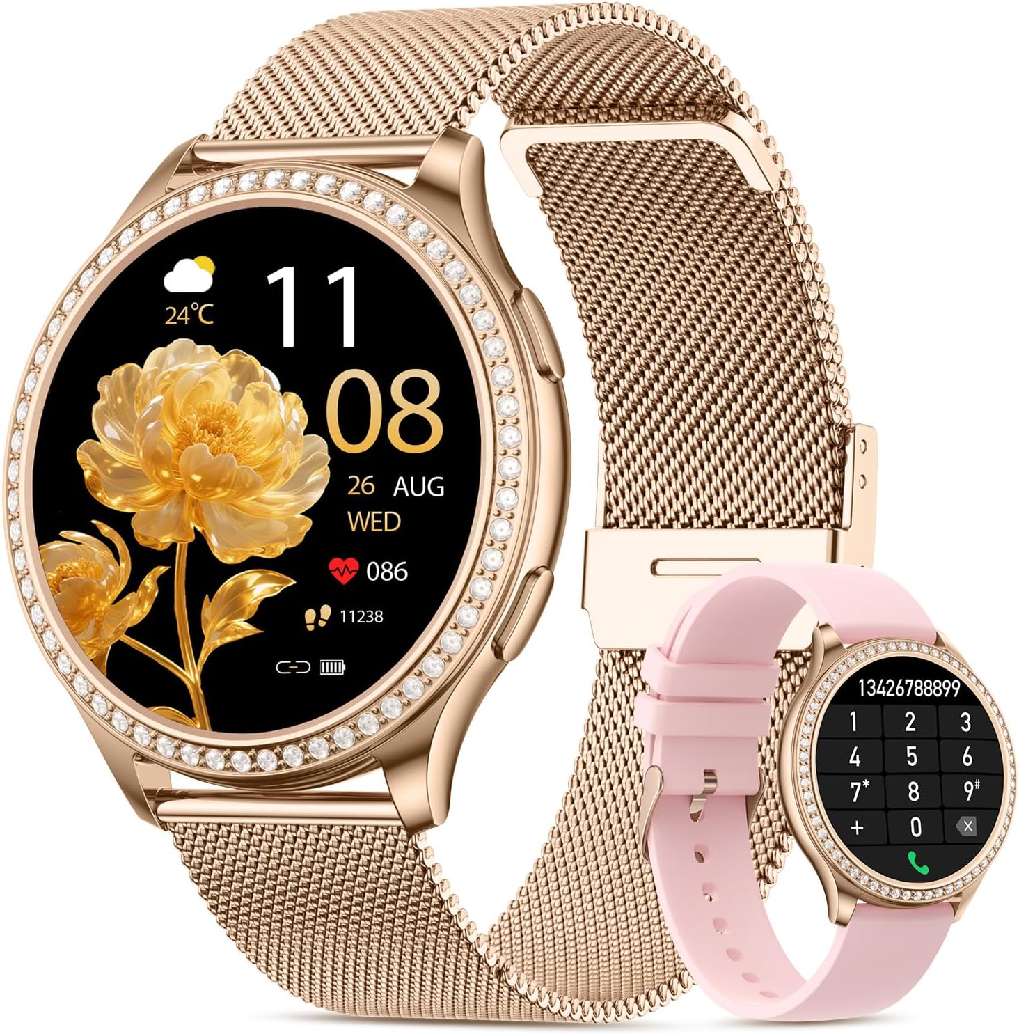 Montre tendance en diamant : la dernière montre intelligente pour femme Miecgth dispose d’une lunette sertie de diamants qui entoure l’écran. Avec un écran couleur HD IPS de 1,32 pouces récemment mis à jour avec une résolution de 360×360, son profil ultra-mince et sa conception légère le rendent confortable à porter. Élégant pour le travail quotidien, impressionnant lors des fêtes. Cette montre intelligente est livrée avec deux bracelets : un élégant bracelet en maille milanaise et un bracelet en silicone doux pour la peau, qui résout le problème de mode fréquent des montres intelligentes traditionnelles qui manquent d’attrait décoratif.