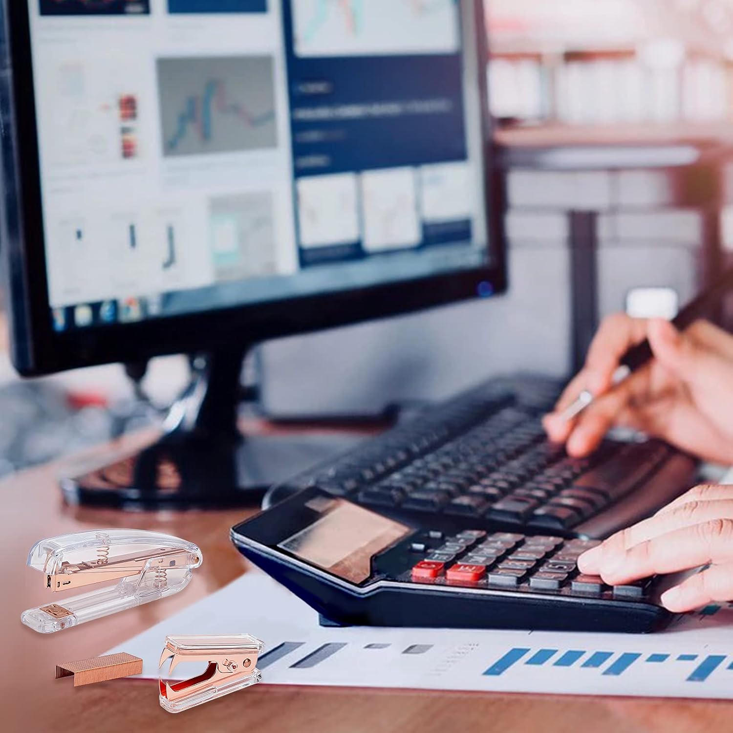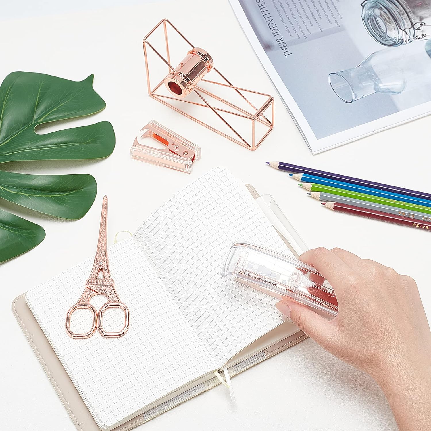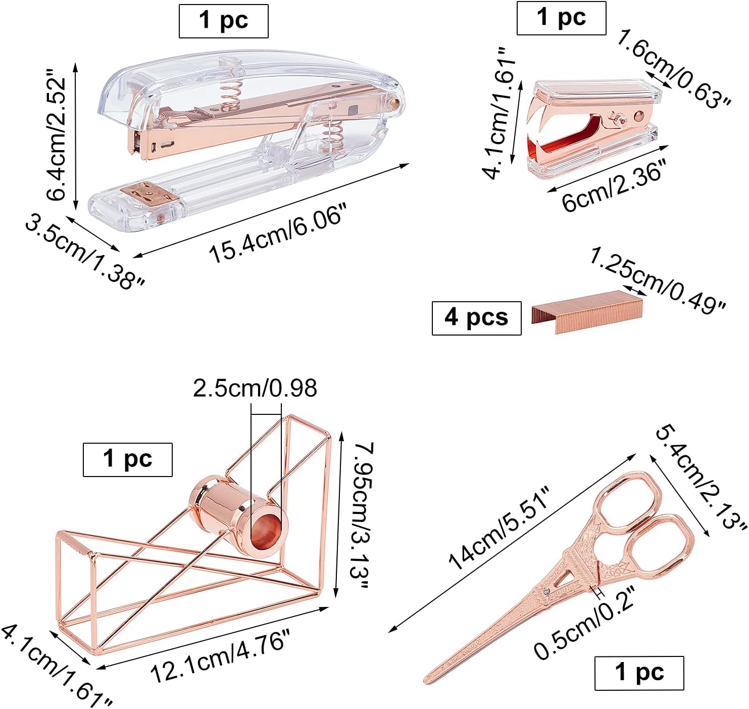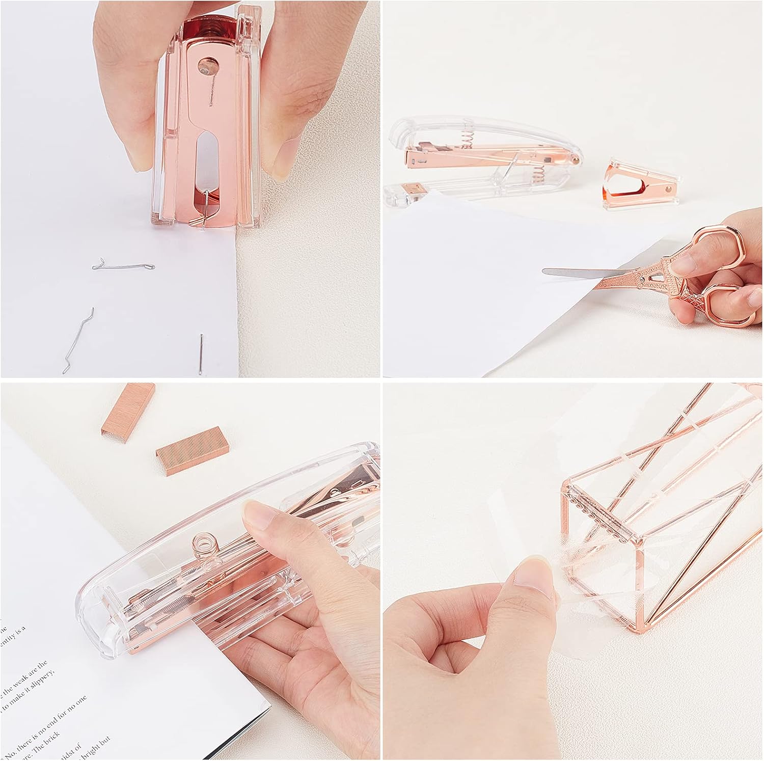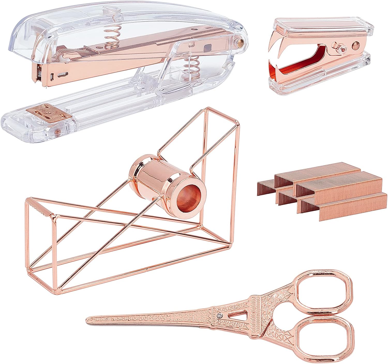 nbeads Kit de papeterie de bureau, 5 kits d’accessoires de bureau, distributeur de ruban adhésif, ciseaux, agrafeuse avec clip en laiton standard 24/6 pour fournitures de bureau à domicile, or rose