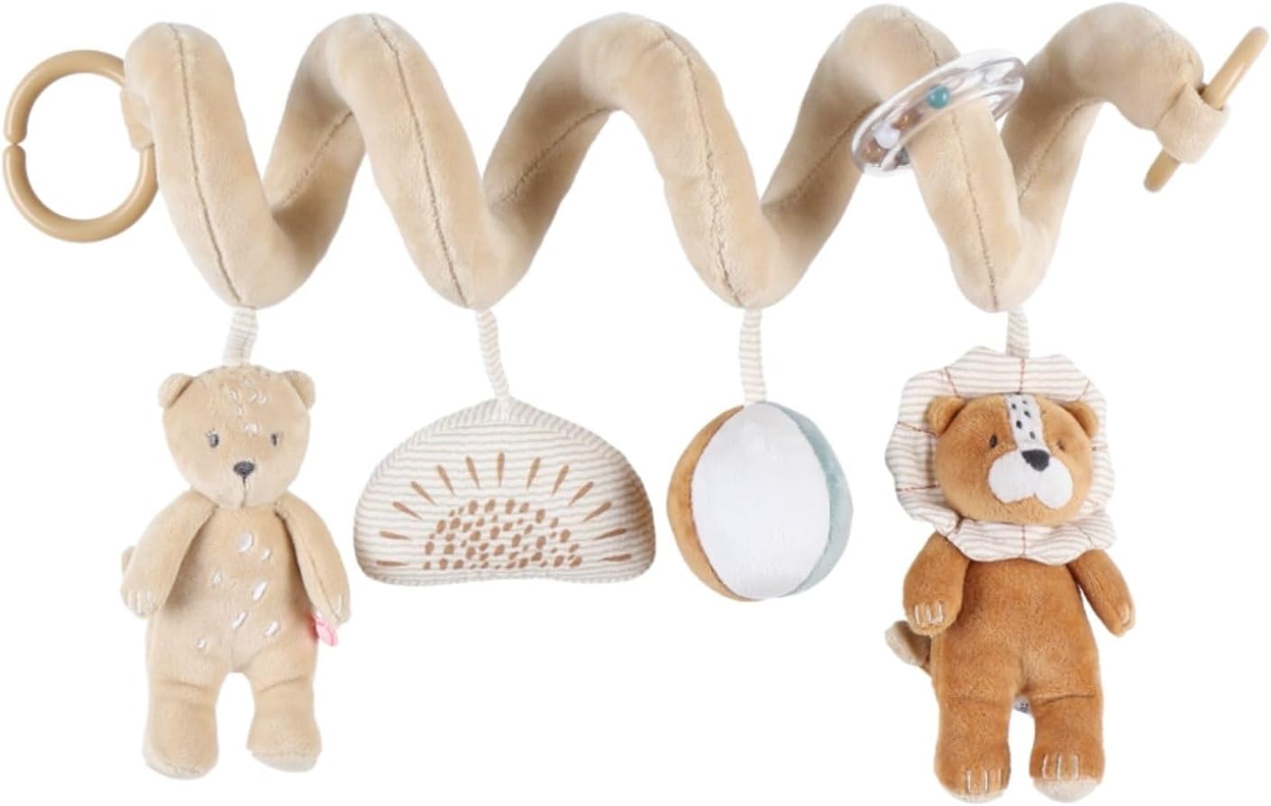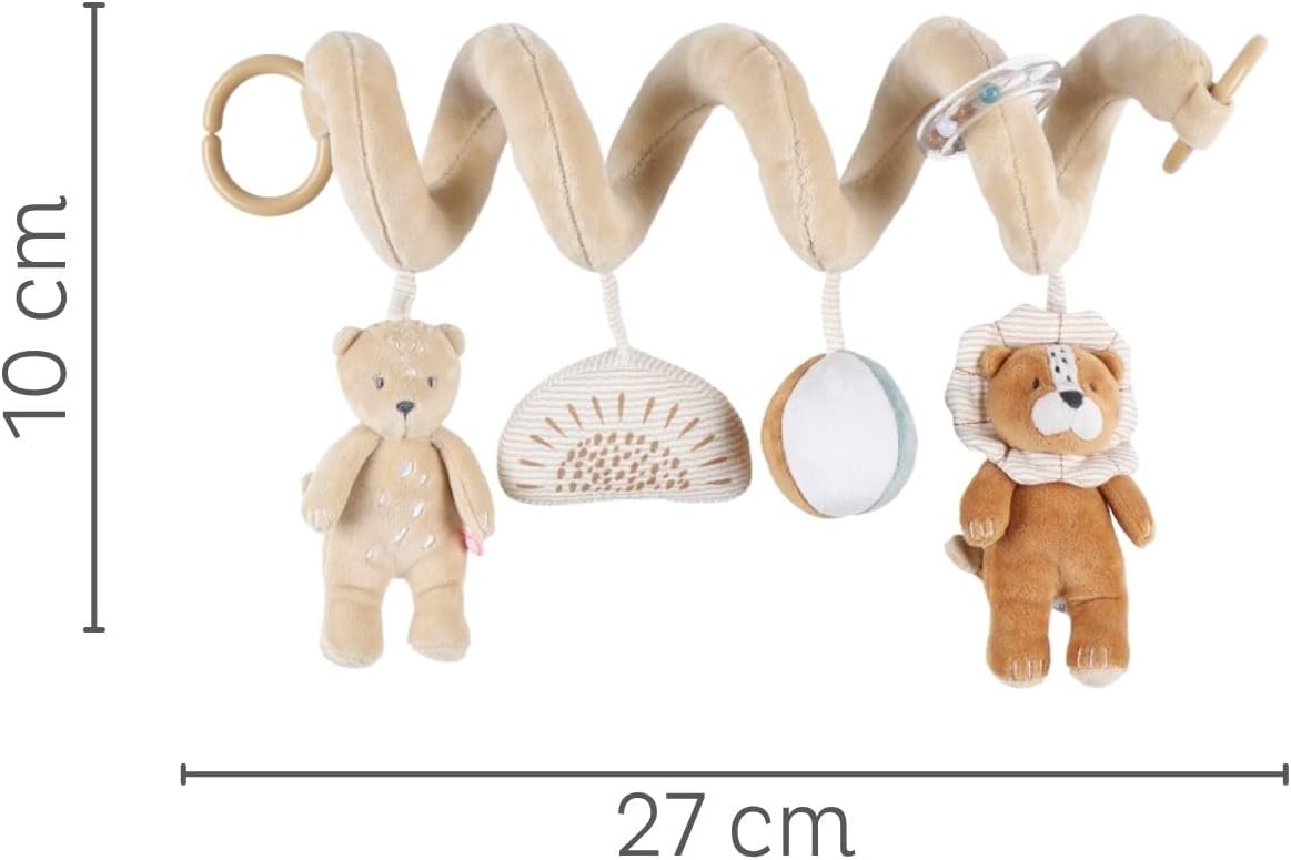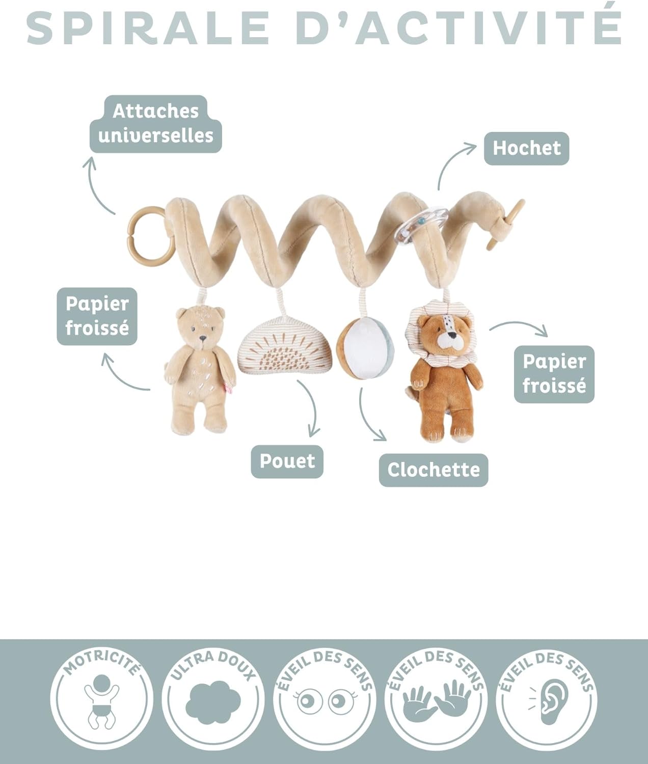 NOUKIE’S – Spirale d’activités pour bébé – Caramel – Lion Babou & Kendi – Douce avec des animaux en peluche – À accrocher sur poussette, siège auto ou lit – Développe les sens – Cadeau naissance