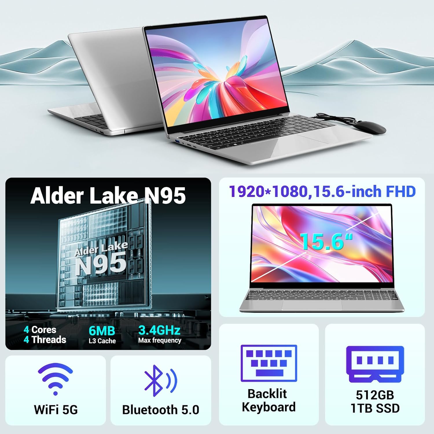 【Processeur N95 haute performance】 Le portable BEYNIVAN 15,6 pouces est équipé d’un processeur quad-core Alder Lake N95 avec une vitesse d’horloge de base de 2,0 GHz (jusqu’à 3,6 GHz), offrant une augmentation de 33 % des performances par rapport aux séries N5095/N5105/N5100. Carte graphique UHD intégrée fonctionne à une fréquence maximale de 1200 MHz, offrant des capacités de traitement graphique améliorées. Il gère sans effort le traitement des documents, garantissant une expérience fluide pour le travail, les études et les loisirs.