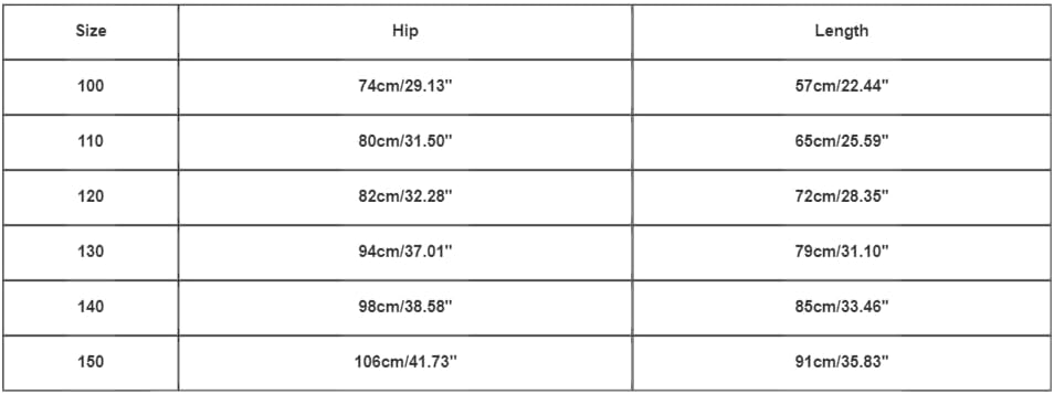 Taille : 140 Hanche : 98 cm/38,58 pouces Longueur : 85 cm/33,46 pouces.