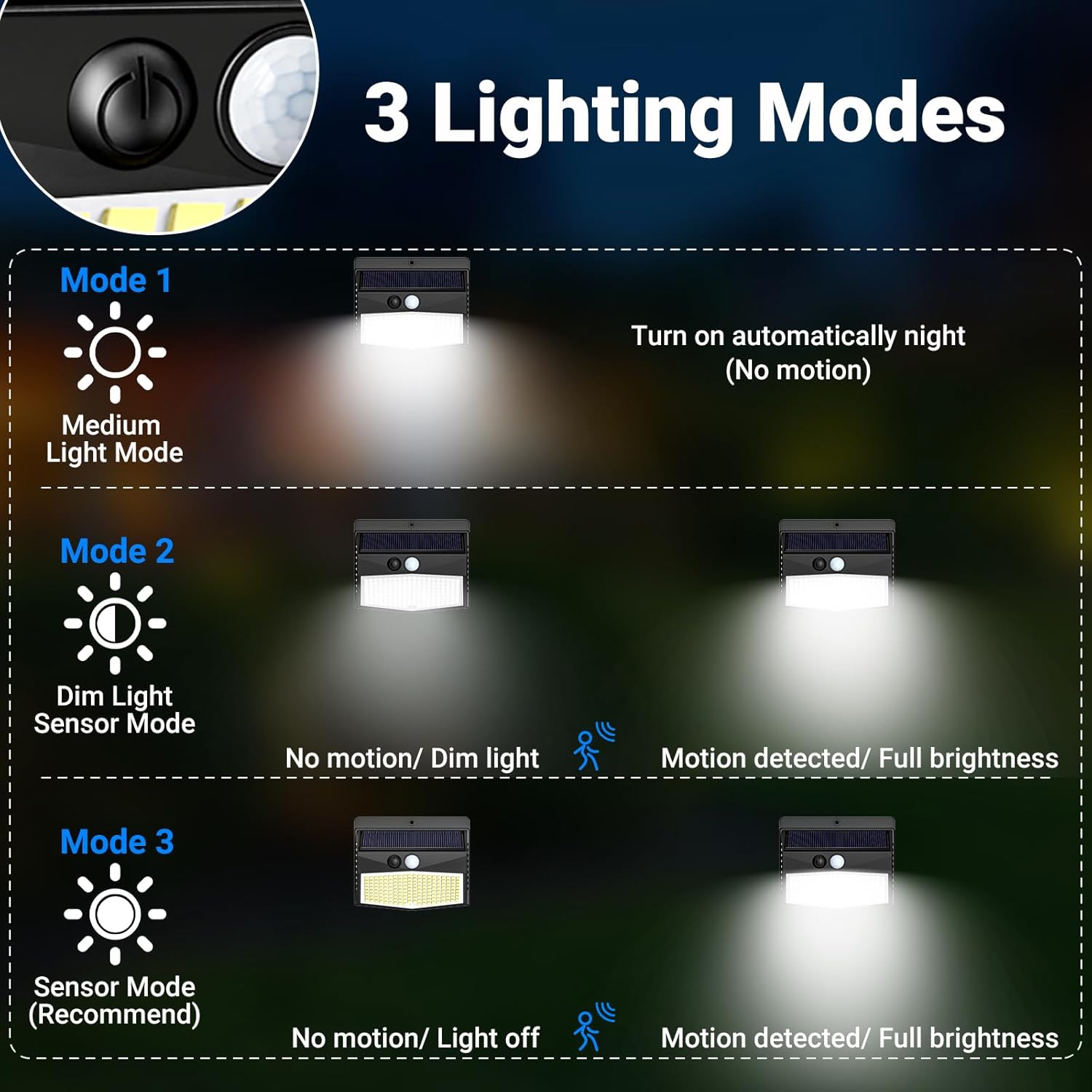 【3 modes】 Répondez à vos différents besoins : mode 1 (mode d’éclairage constant) s’allume automatiquement la nuit et s’éteint automatiquement pendant la journée. Mode 2 (mode de détection de faible luminosité) Faible luminosité lorsqu’il n’y a pas de mouvement, forte luminosité lorsqu’un mouvement est détecté. Mode 3 (Mode de détection) Éteint lorsqu’il n’y a aucun mouvement, pleine lumière lorsqu’un mouvement est détecté. (Le plus économe en énergie, recommandé)