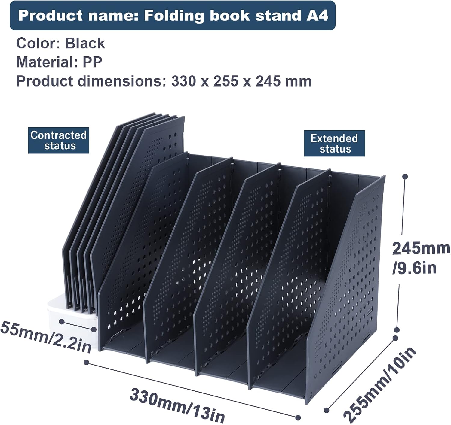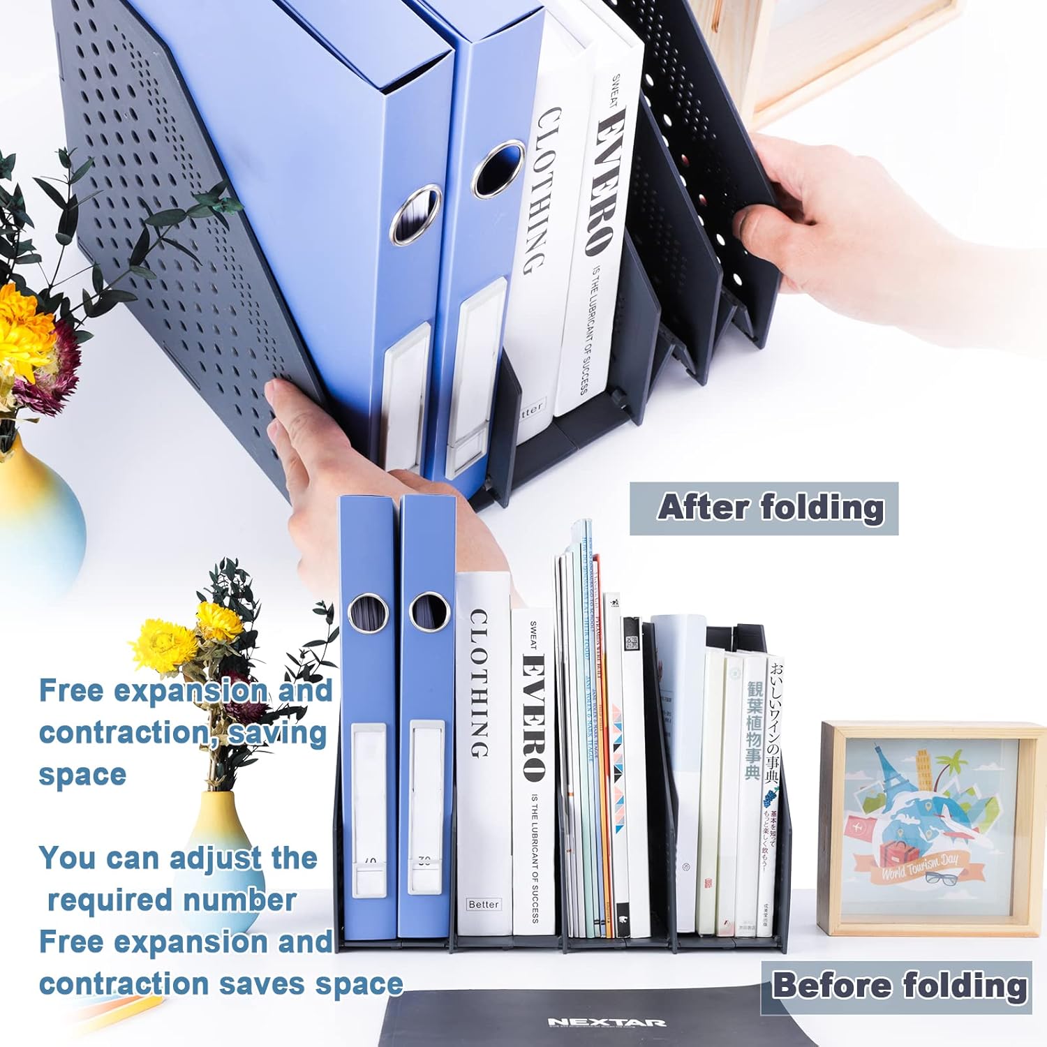 Porte-revues pliable : classeurs à magazines, faciles à installer et à régler, la largeur peut être ajustée en fonction du scénario d’utilisation, la largeur minimale une fois pliée est d’environ 5,5 cm, facile à ranger et à transporter.
