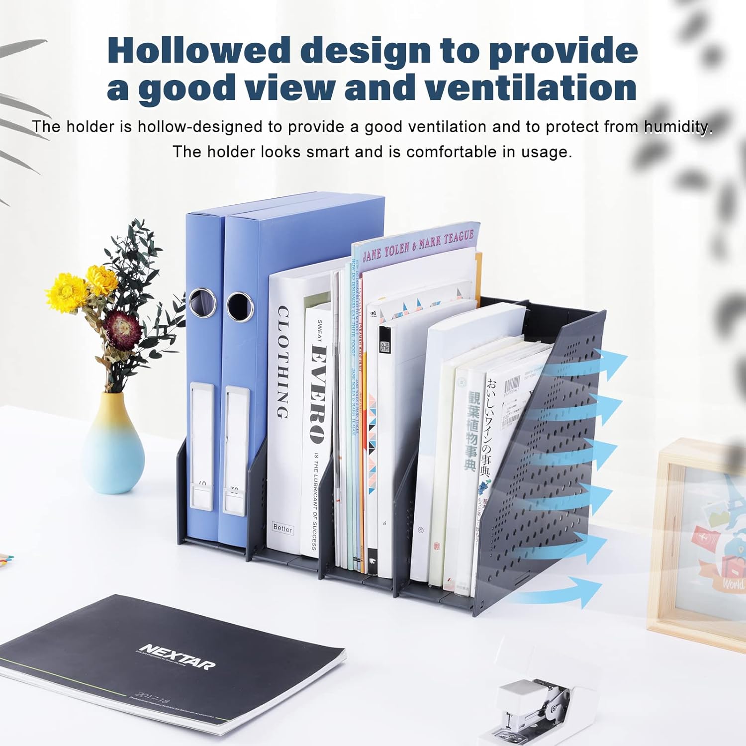 Organisation du bureau : Grâce à sa conception ouverte, le porte-revues n’a aucune limite en termes de taille de stockage. Vous pourrez y ranger des livres ou des documents au format A5, B5, A4, A3 ou plus, ainsi que de la papeterie ou des petits objets.
