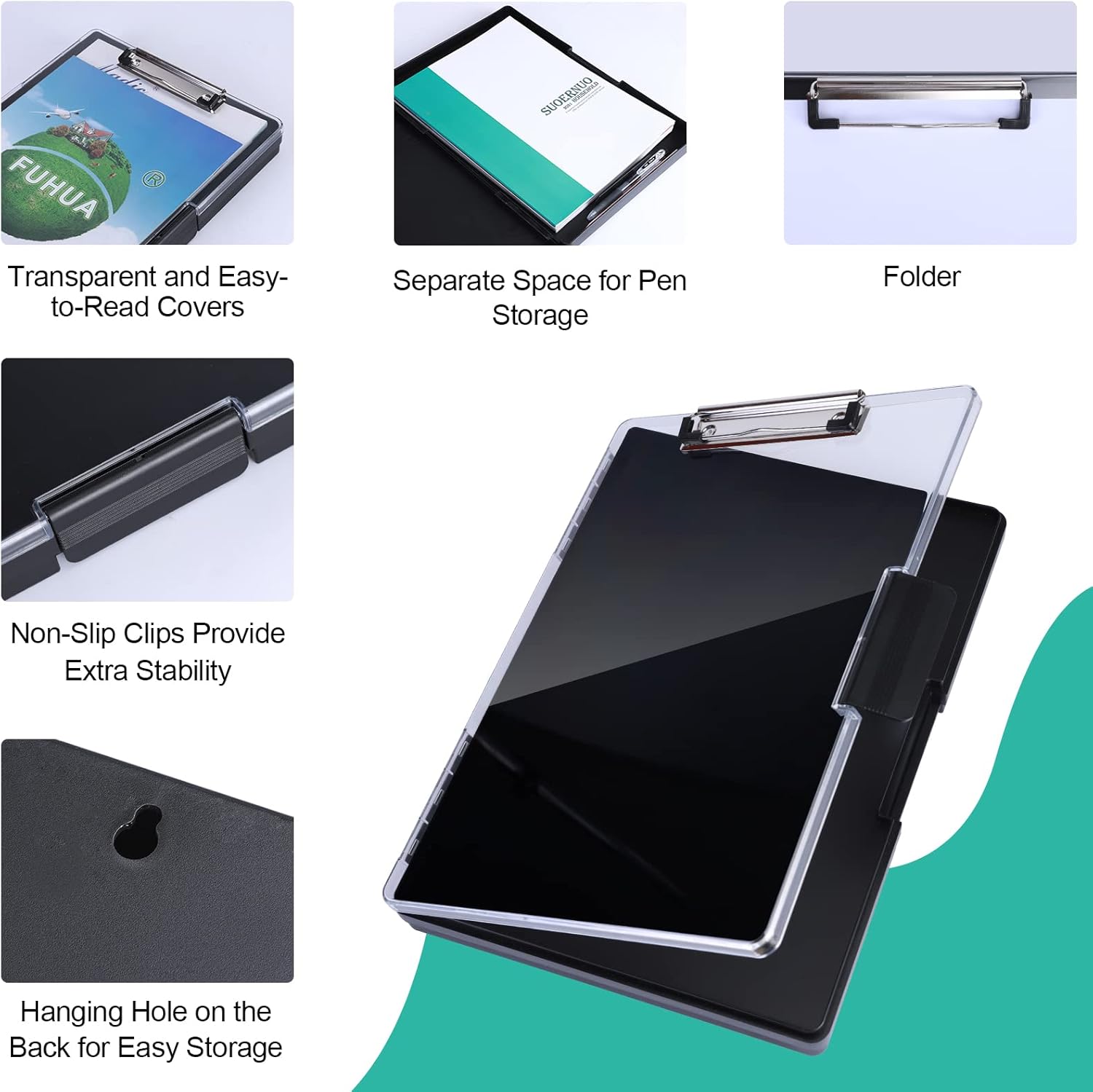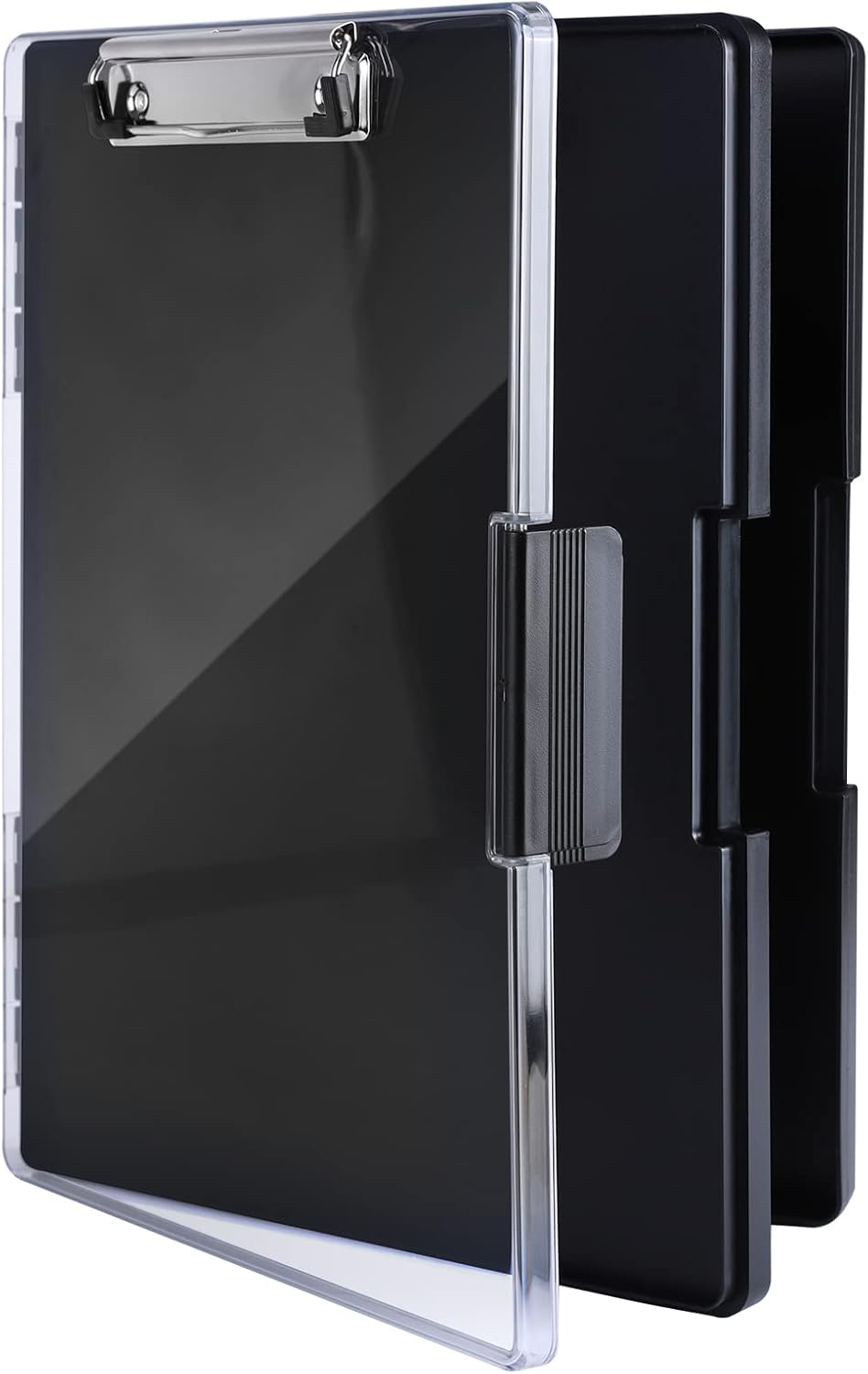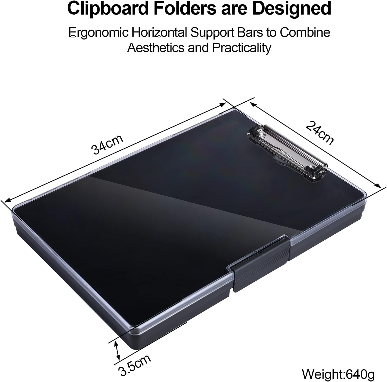 Presse-papiers A4 avec compartiment de rangement, plastique avec étagère, porte-papier léger, presse-papiers portable avec compartiment, idéal pour l’école, l’industrie, le bureau (noir)