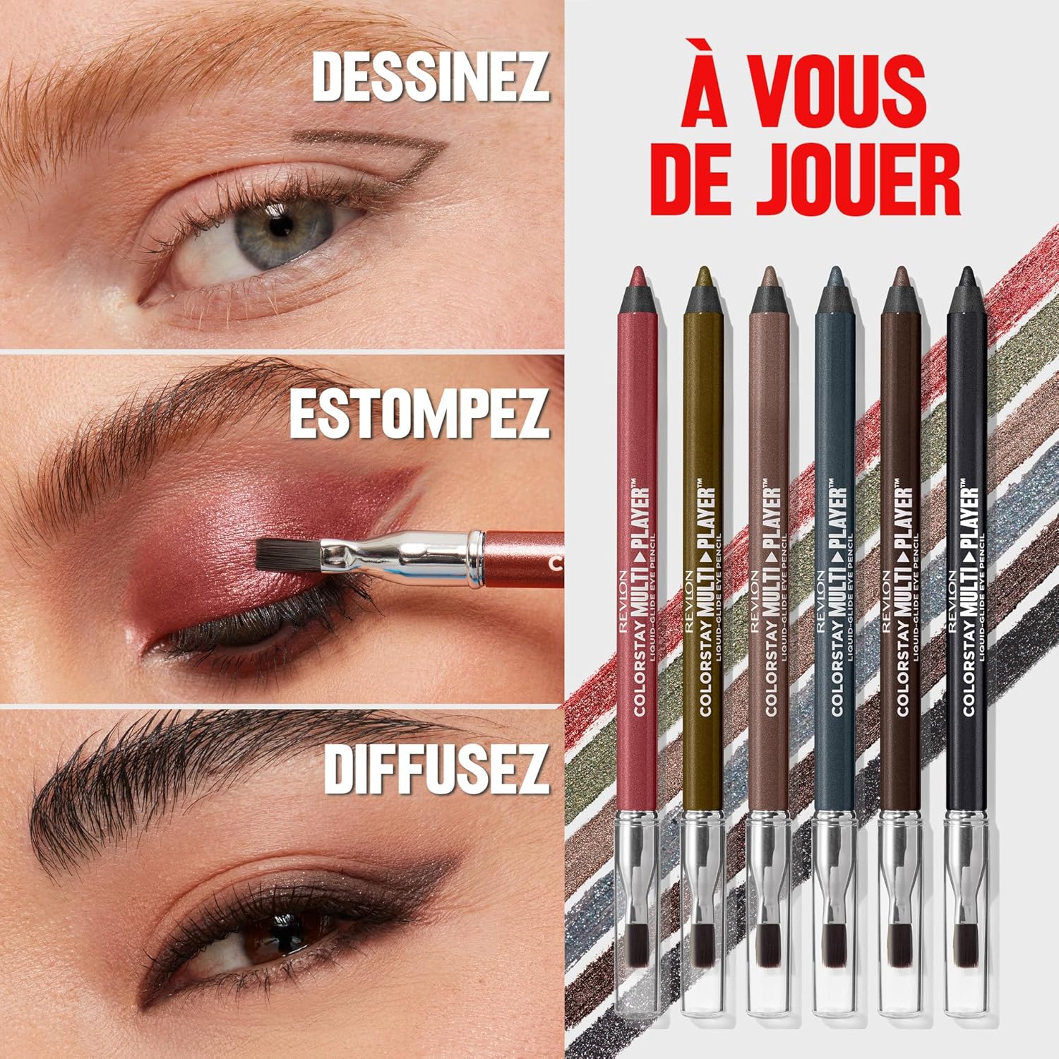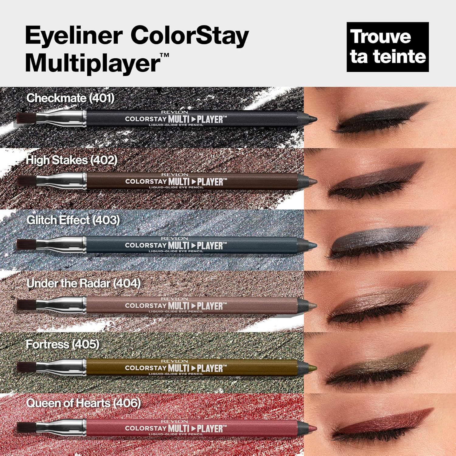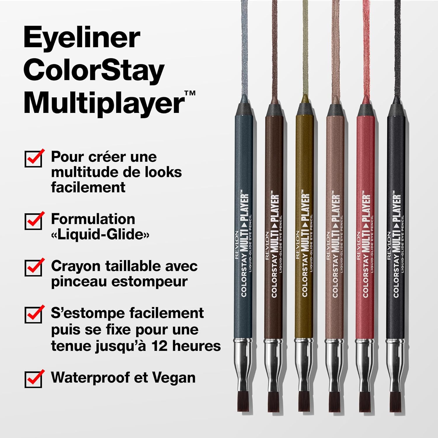 Dessinez, coloriez et mélangez. C’est à vous! Créez des looks infinis qui durent toute la journée avec les crayons pour les yeux Revlon ColorStay Multiplayer Liquid-Glide. La formule ultra fondante glisse sur la peau et s’estompe facilement. Etanche, ce produit résiste à toute épreuve pendant 12 heures. Disponible en 6 teintes qui conviennent à toutes les carnations et à toutes les occasions.