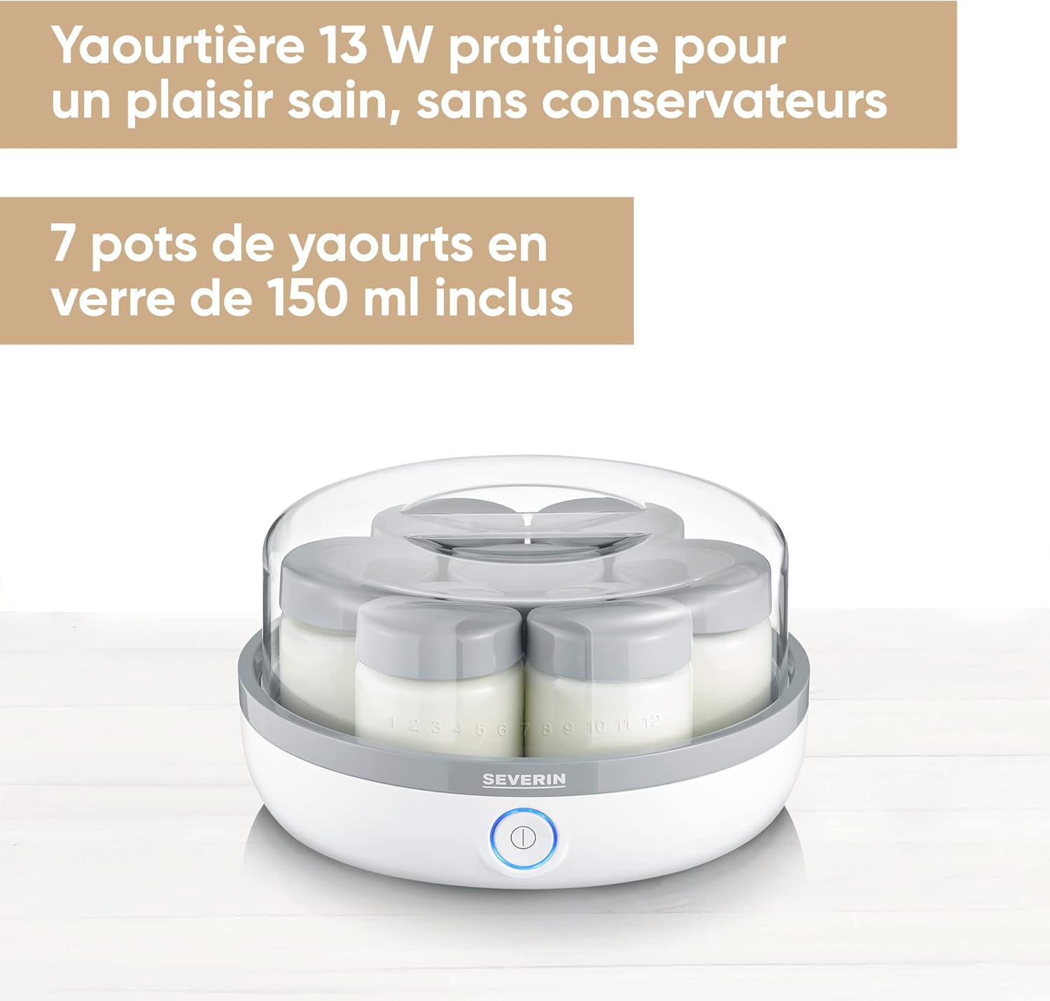 Livraison et détails – Petite yaourtière électrique Severin 13 W pour faire des yaourts faits maison, 7 pots de 150 ml sans BPA inclus, passe au lave-vaisselle, mémo pratique pour remise de diplôme, fonctionnement silencieux.