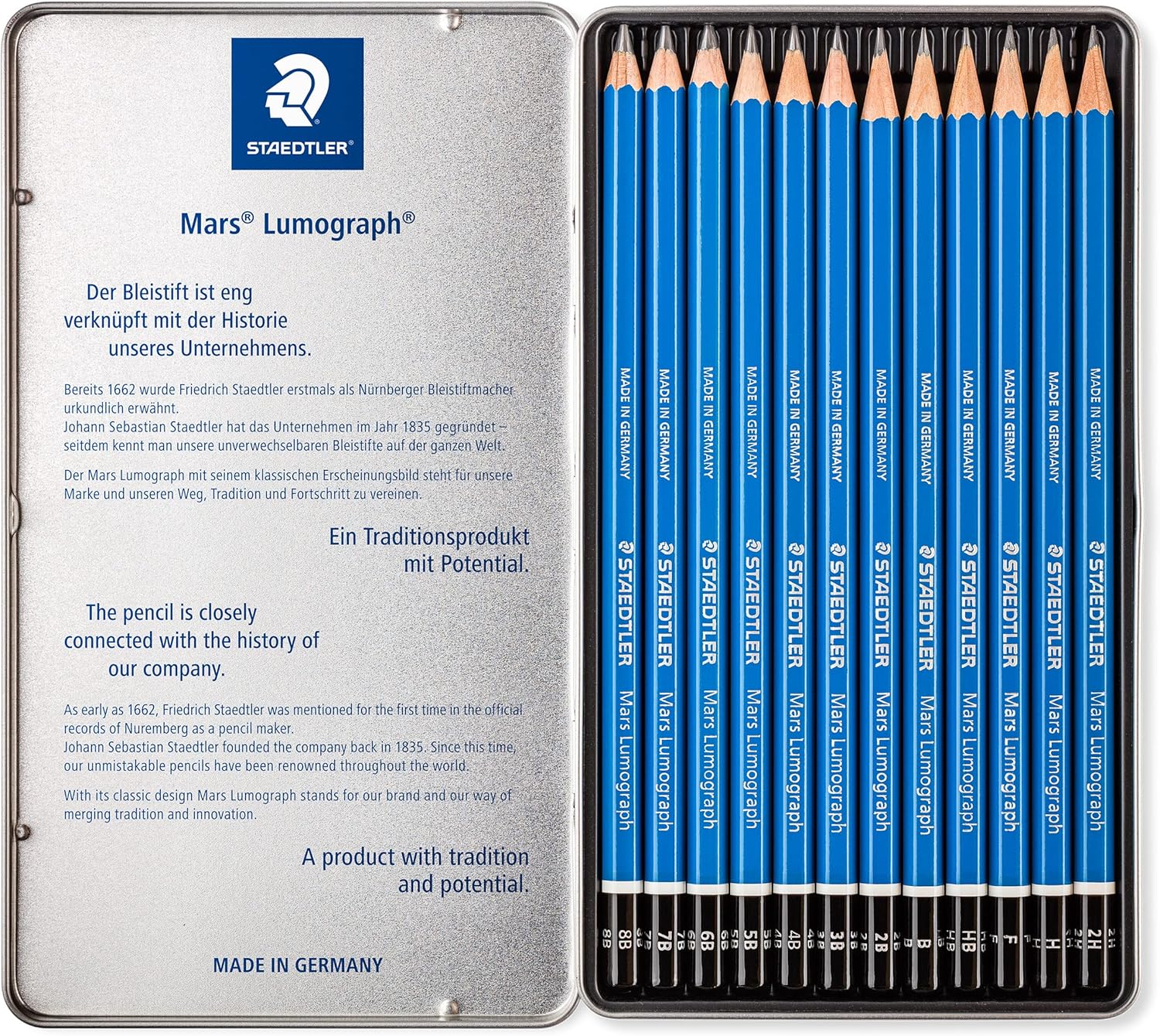 Staedtler Mars Lumograph, crayons de très haute qualité pour l’écriture et le dessin artistique, boîte en métal avec 12 crayons assortis 8B-2H, 100 G12 S