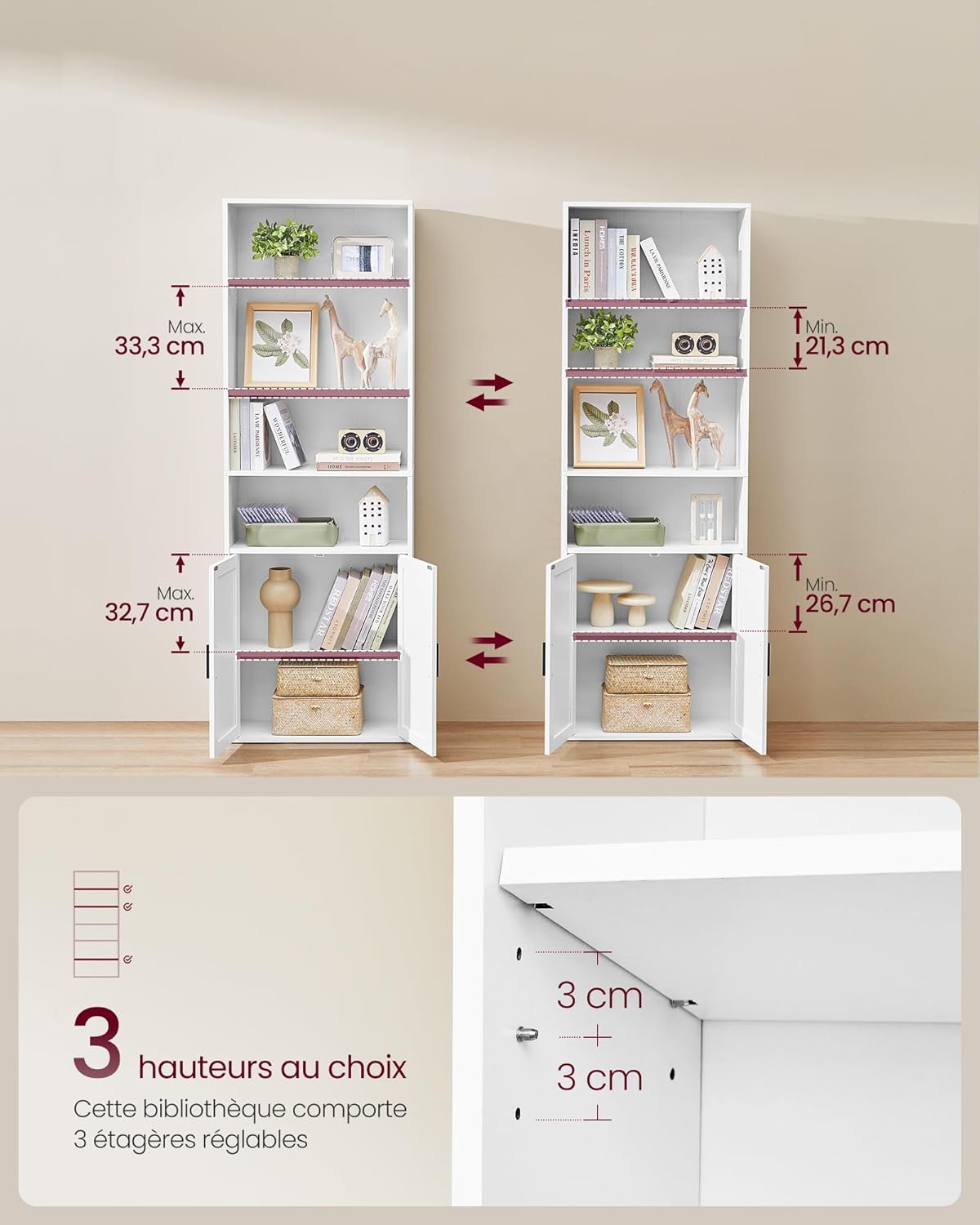 ÉTAGÈRES RÉGLABLES : Les 1ère, 4ème et 5ème étagères sont réglables jusqu’à 3 cm de haut en bas pour accueillir des objets de différentes hauteurs. Ainsi vos livres et bibelots trouveront parfaitement leur place dans cette bibliothèque