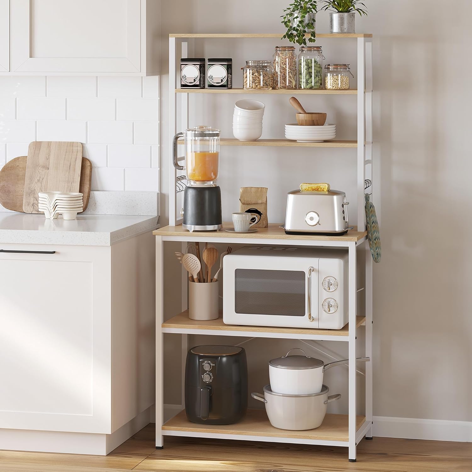VASAGLE KKS019W09 Etagère de cuisine pour machine à café, 6 étagères et 6 crochets pour four à micro-ondes, structure en acier, style industriel, 40 x 80 x 167 cm, chêne et blanc KKS019W09