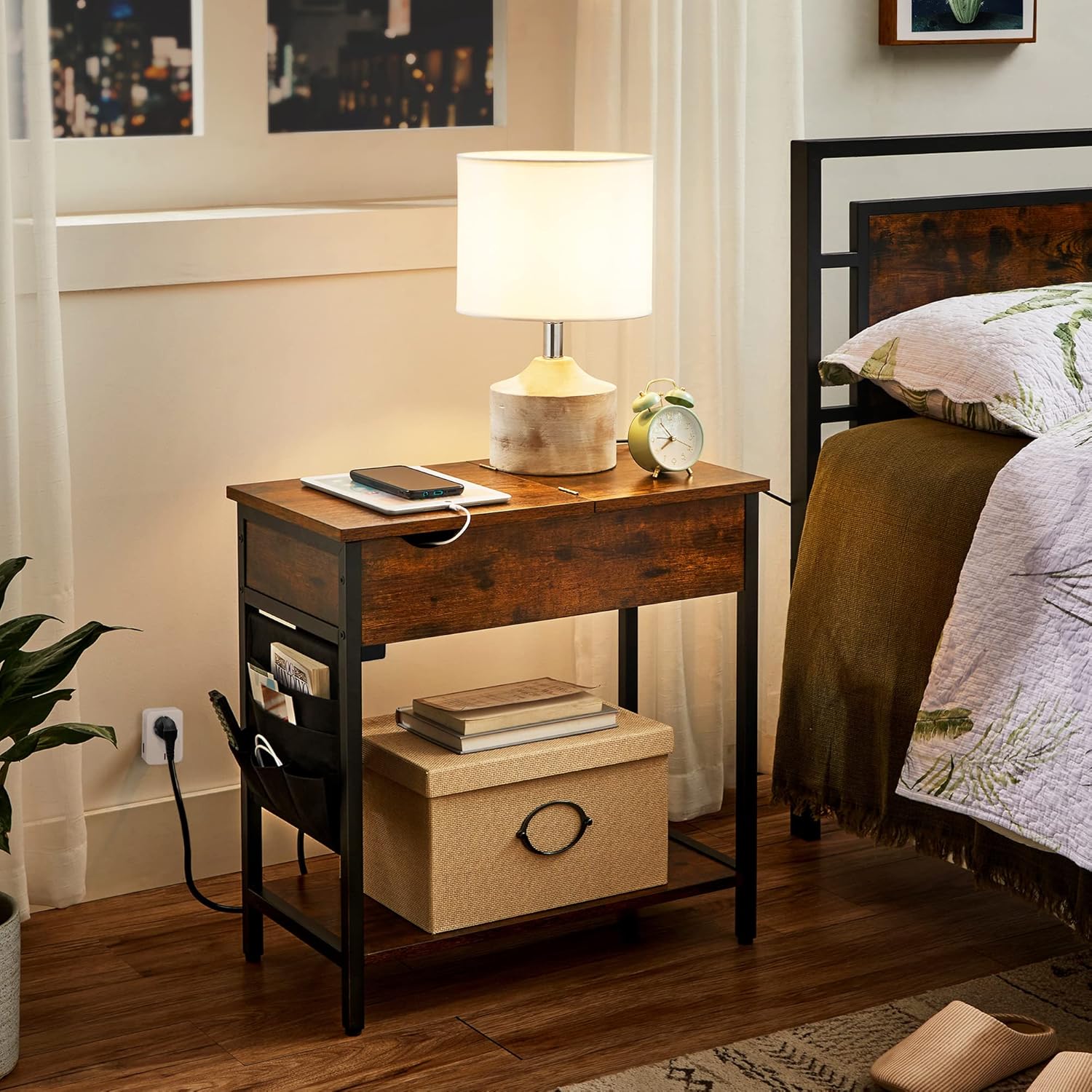 VASAGLE LET311B01 Table de chargement avec prise électrique, table de chevet pliante avec étagère de rangement et sac en tissu, pour salon, chambre à coucher, marron rustique et noir