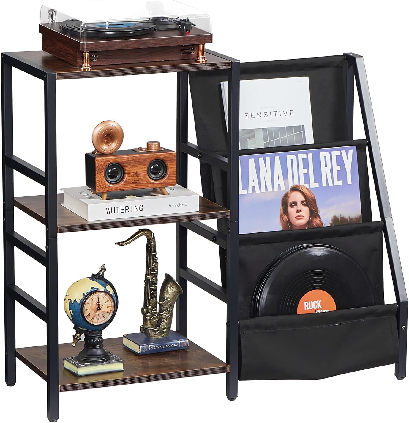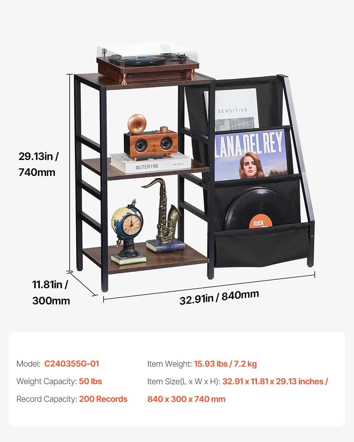 CHARGEMENT ET ÉCLAIRAGE INTÉGRÉS Équipé d’une multiprise de haute qualité pour une connexion facile à divers appareils et d’une fonction d’éclairage unique qui se synchronise avec votre musique, ce support pour lecteur vinyle améliore votre expérience. Des cloisons marron vintage, combinées à un cadre en acier inoxydable durable, assurent durabilité et style